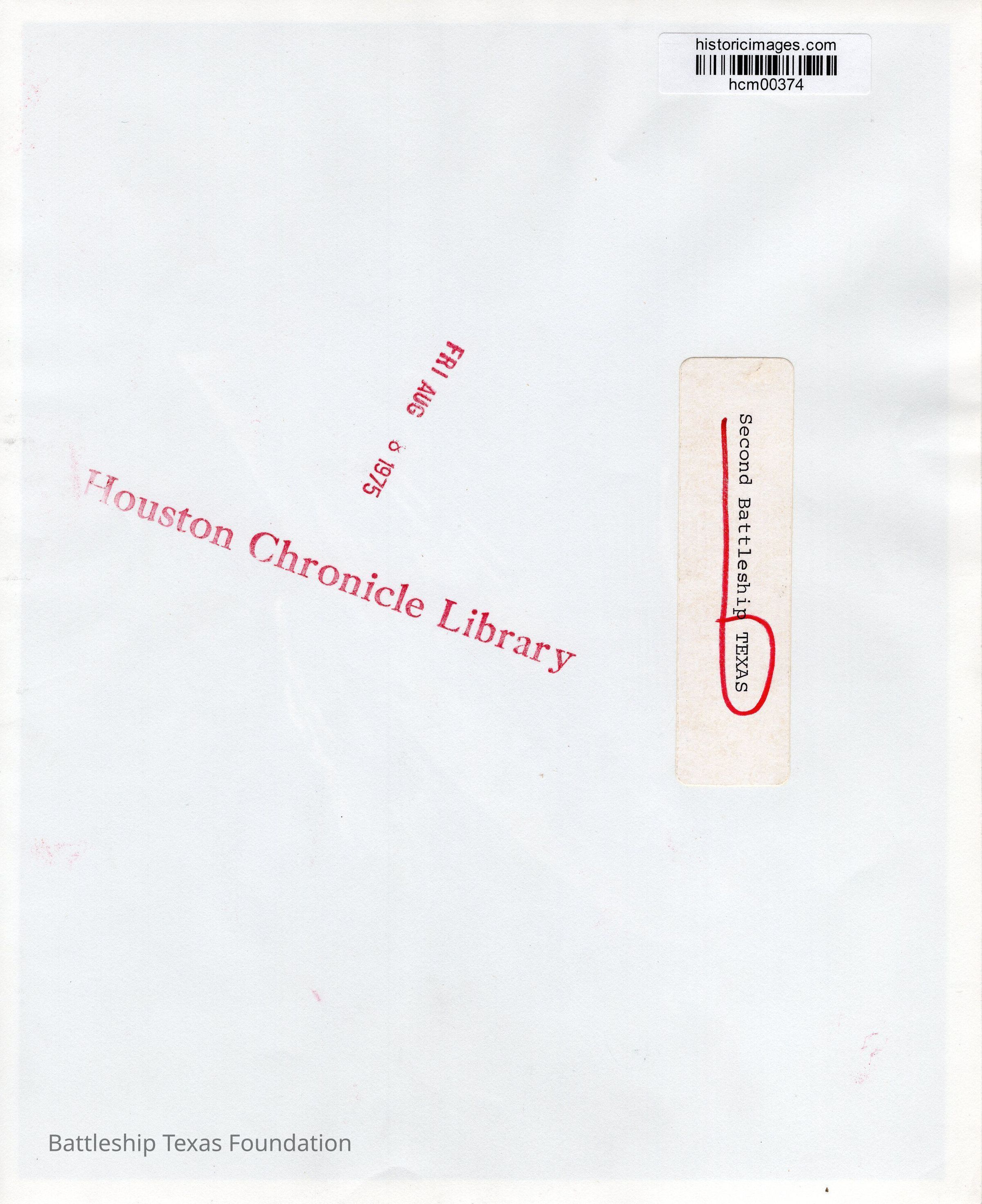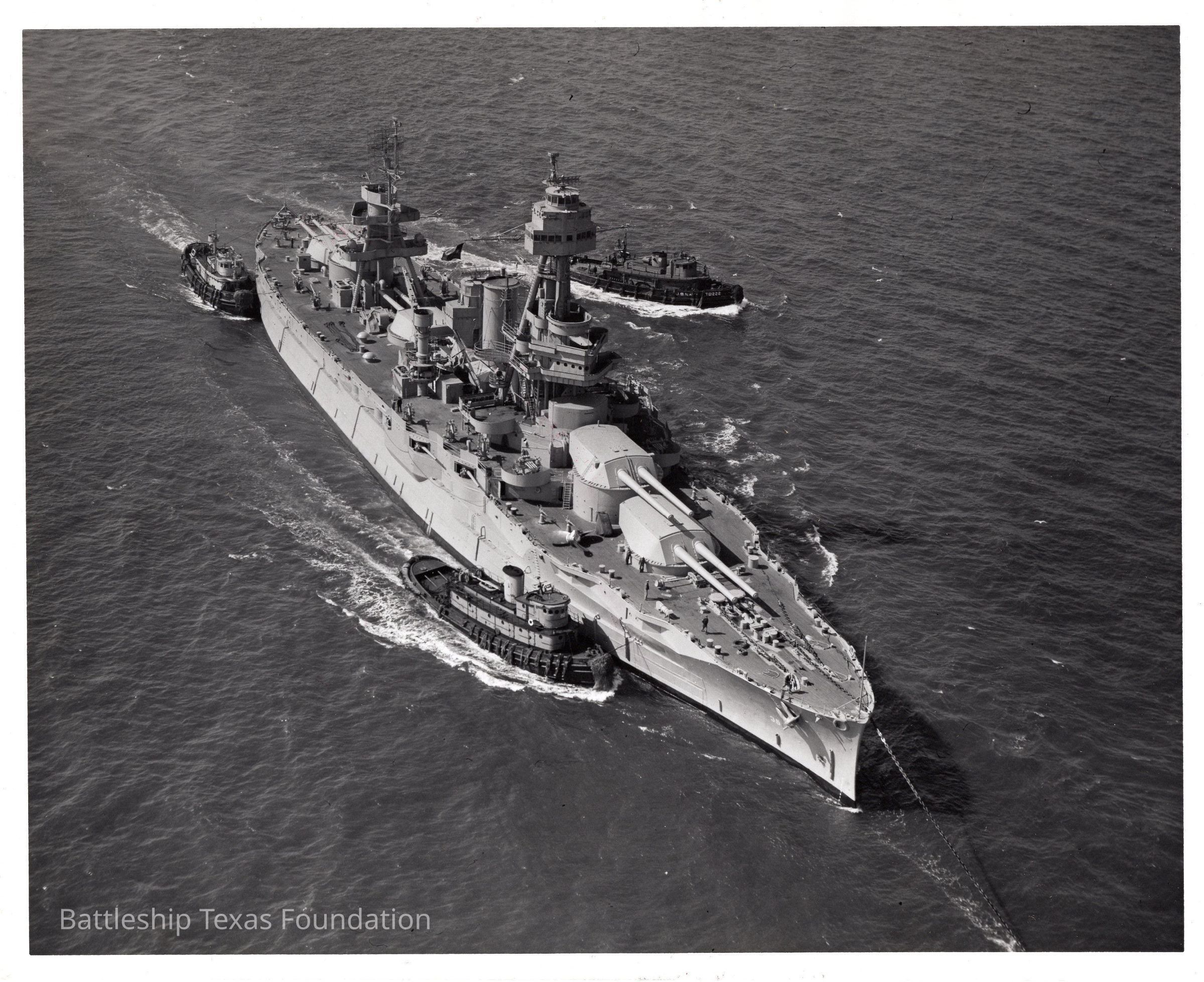 Texas being escorted by three tugs. Propellor on deck. Haze gray paint. Sticker on back reads "Second Battleship Texas"Context