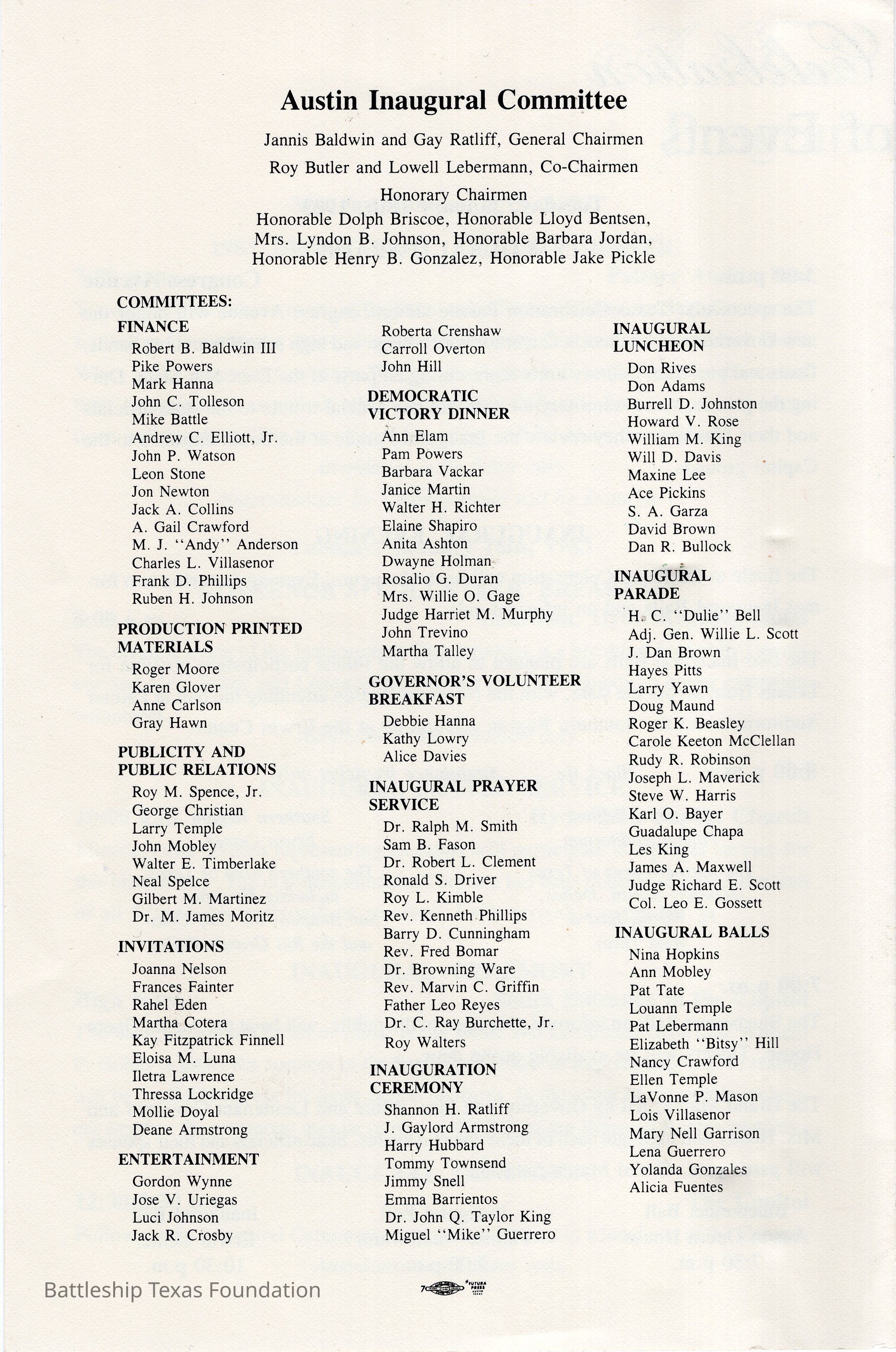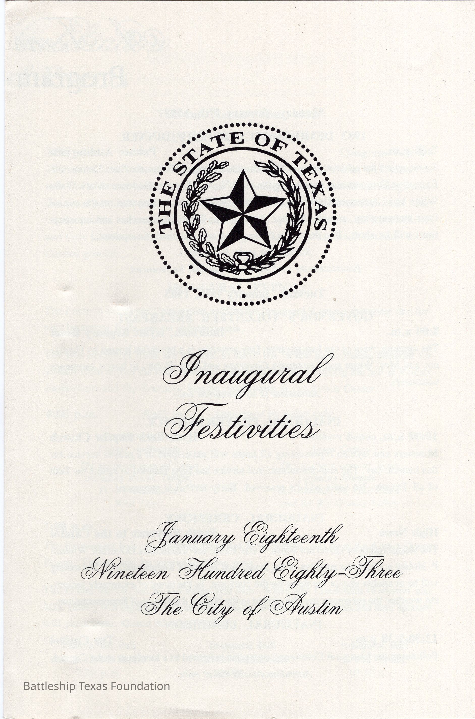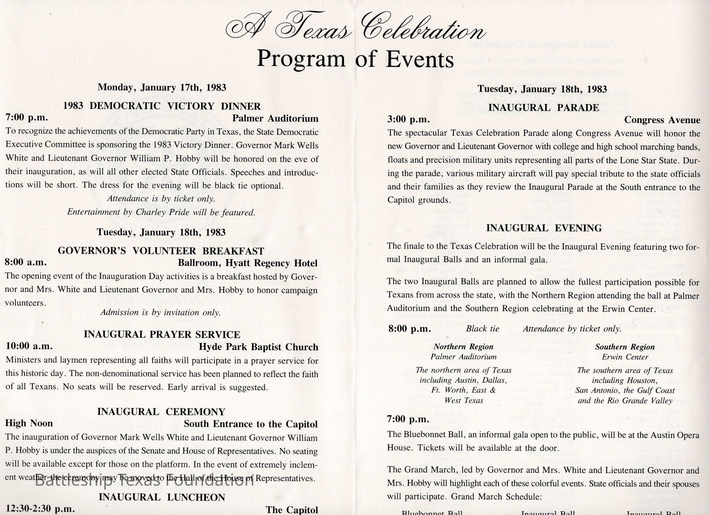 Pamphlet for the 1983 Texas inaugural festivities celebrating the Democrat's victories in the state.Context