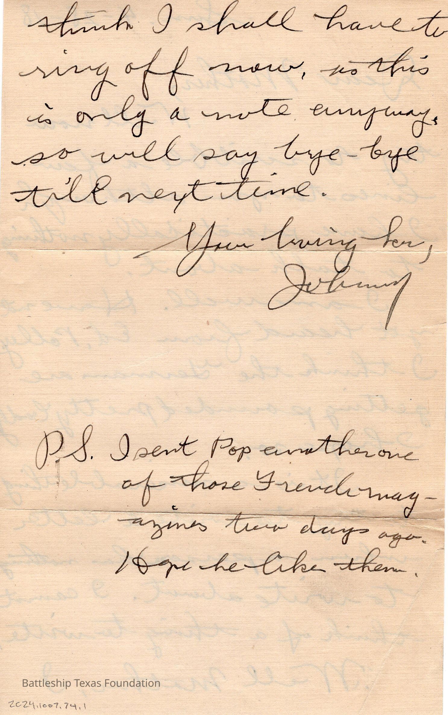 John Lamson was a MM1c on Battleship Texas from May 1917 to June 1919. Throughout his time on Texas, he sent a letter to his family at least once a week, often more. Longer stretches of absence are explained either by movement across the Atlantic, or with the Grand Fleet.