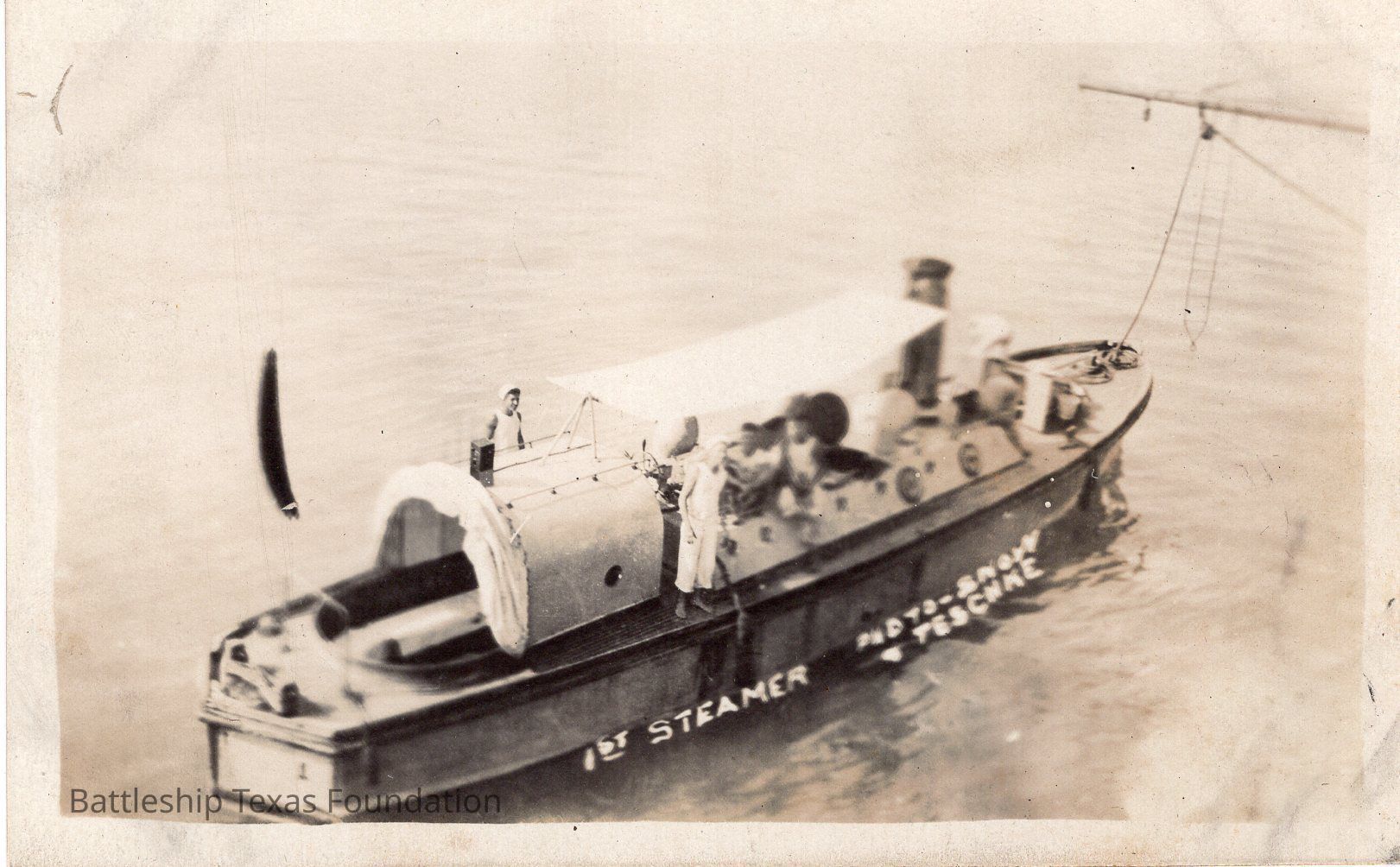 Covered utility boat pointed to right of photo. Captioned "1ST STEAMER"Context