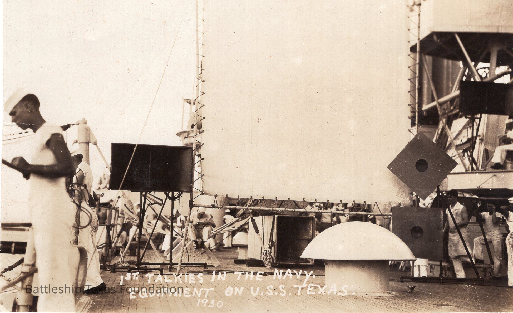 Shows canvas screen on deck of Texas. Men sitting behind it. Photograph captioned "1st TALKIES IN THE NAVY. EQUIPMENT ON U.S.S. TEXAS. 1930"Context