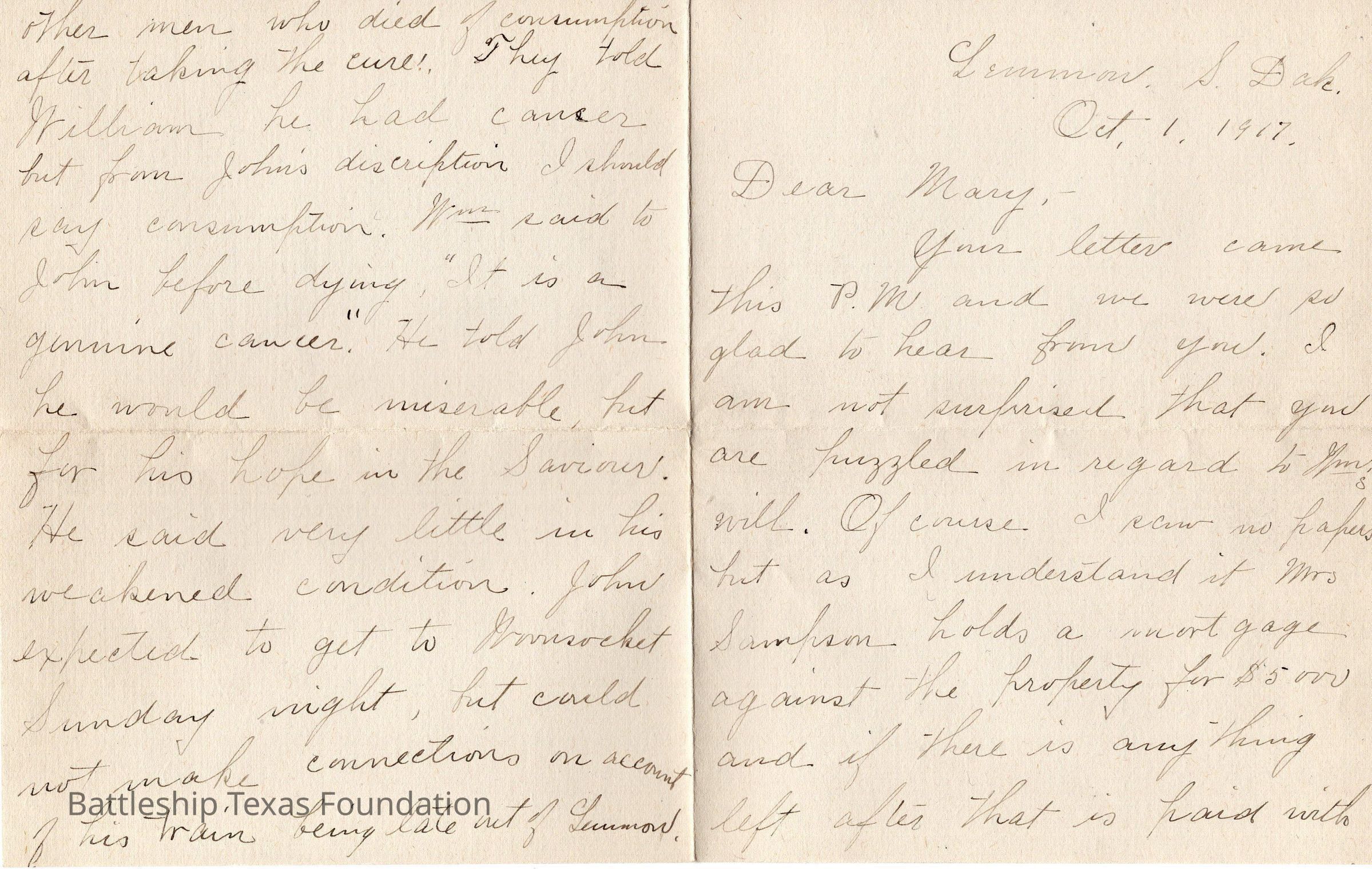 Letter dated October 1, 1917 (Oct. 1, 1917) and addressed to Mary. Letter written in this order: right side of front page, back of page lengthwise, then the left side of the front page.Context