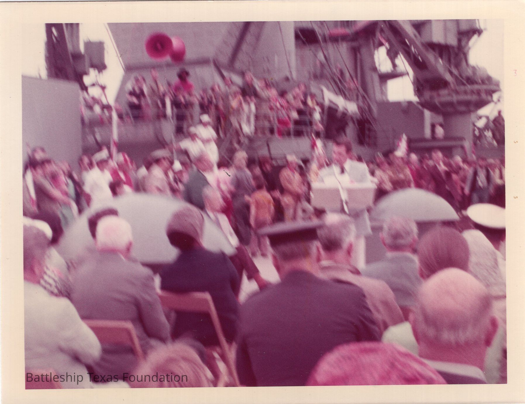 Photo dated April 21, 1973. Image not focused. Taken on starboard side by turret #3. People seated on main deck, and watching from superstructure around aft fire control tower. Speaker is Texas Lieutenant Governor William P. Hobby Jr.Context