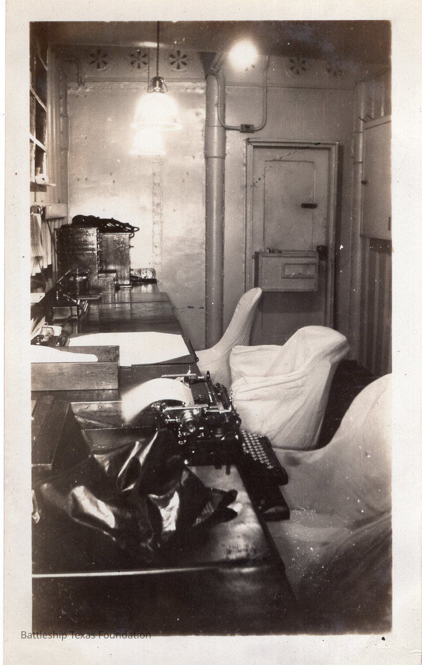 Officer’s quarters in 2nd deck, most likely the ordinance office, with three chairs sat at a desk, the closest with a typewriter. Back reads "1930"Context