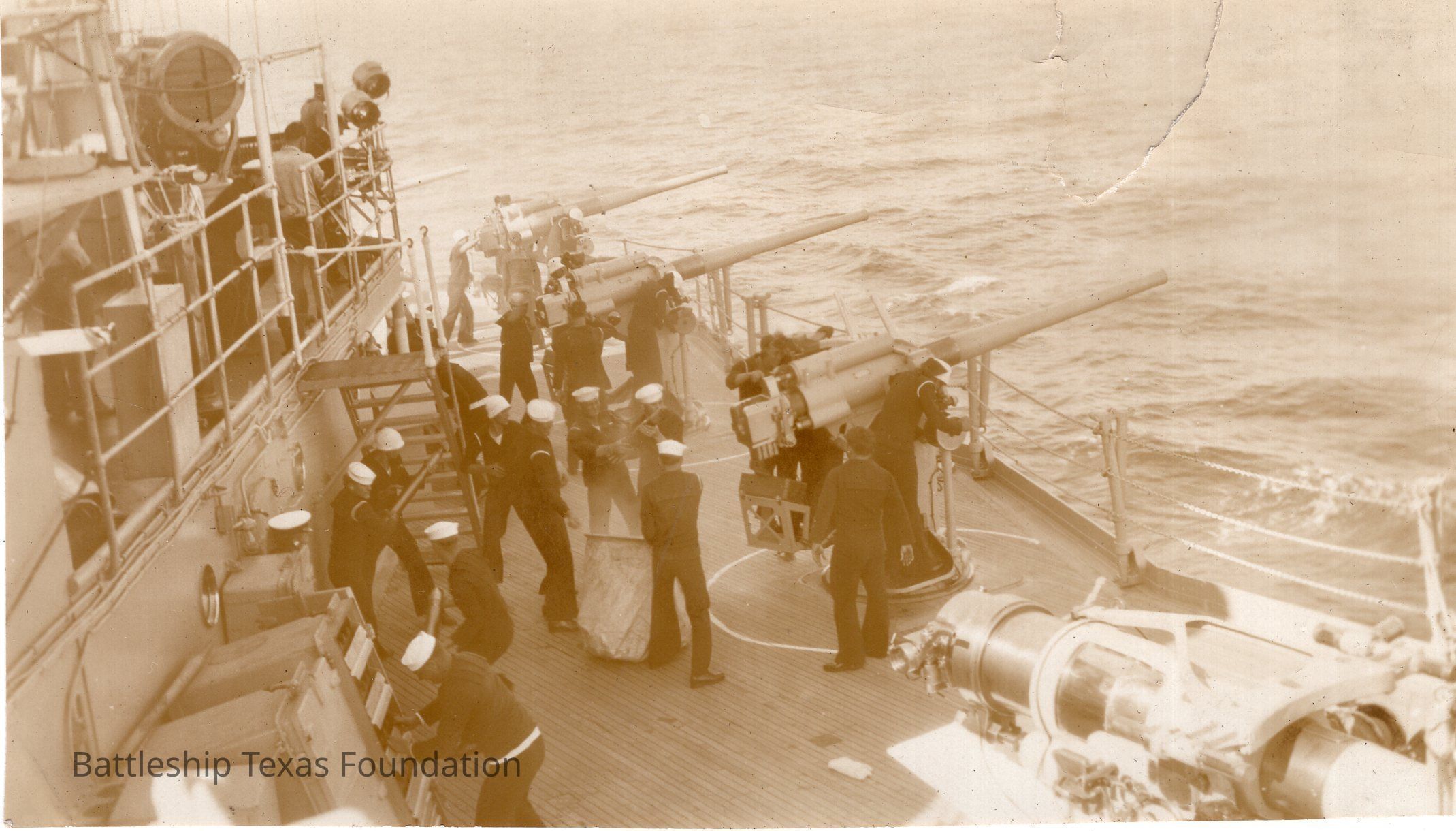 Features sailors around three 3"/50cal guns on the portside 01 deck.Context