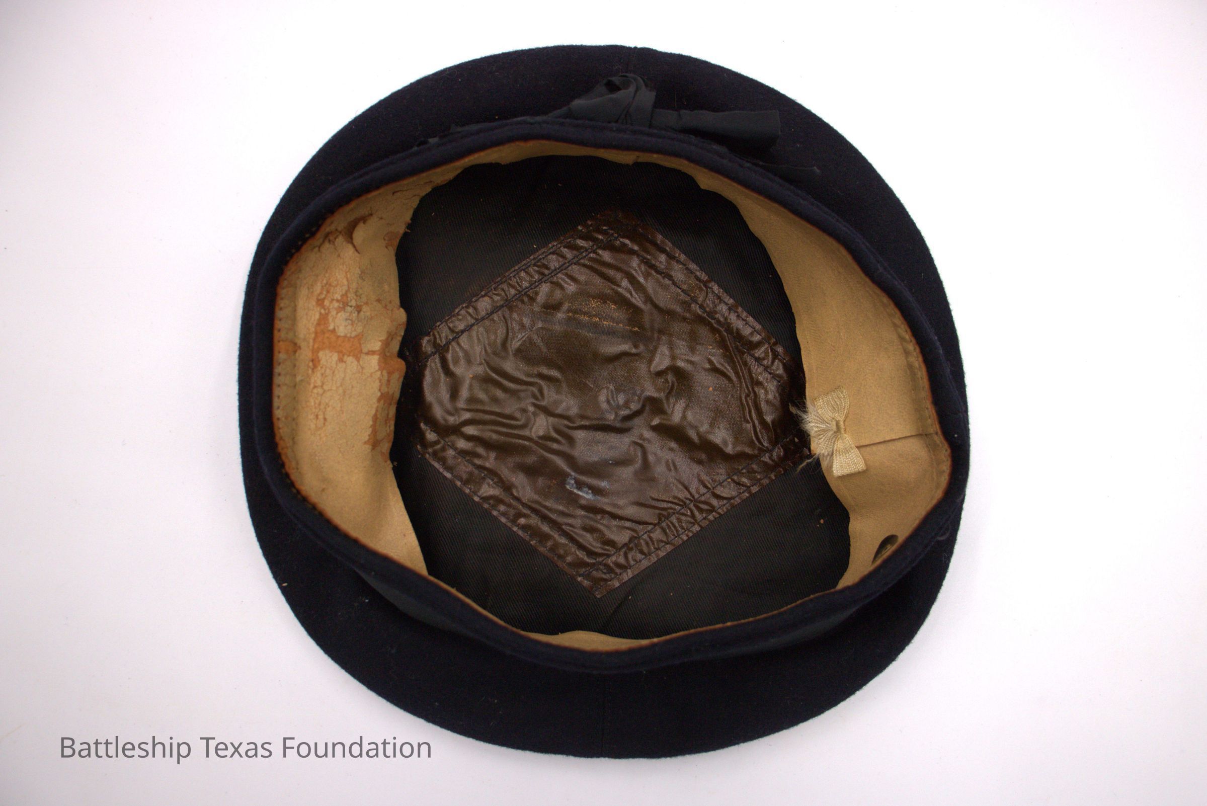Flattopped hat with "U.S. NAVY" on front and bow on the side.Context