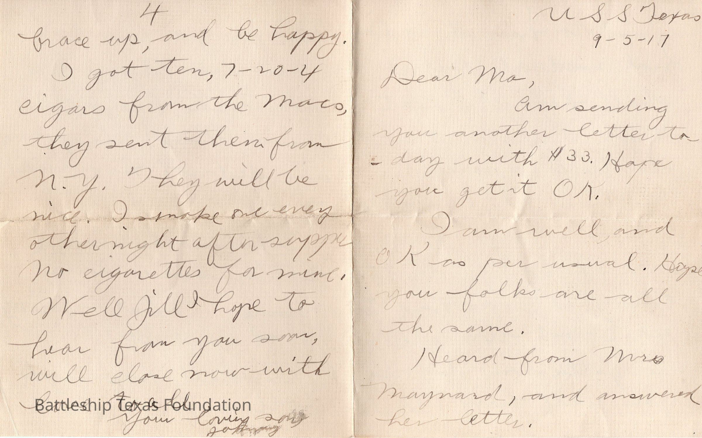 letter dated to September 5, 1917 (9-5-17), with USS Texas above the date, and addressed to Ma.Context