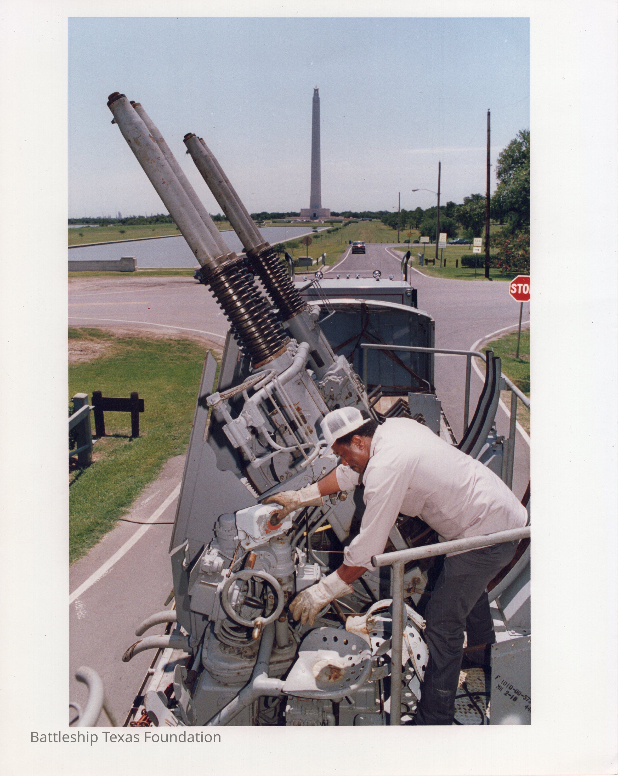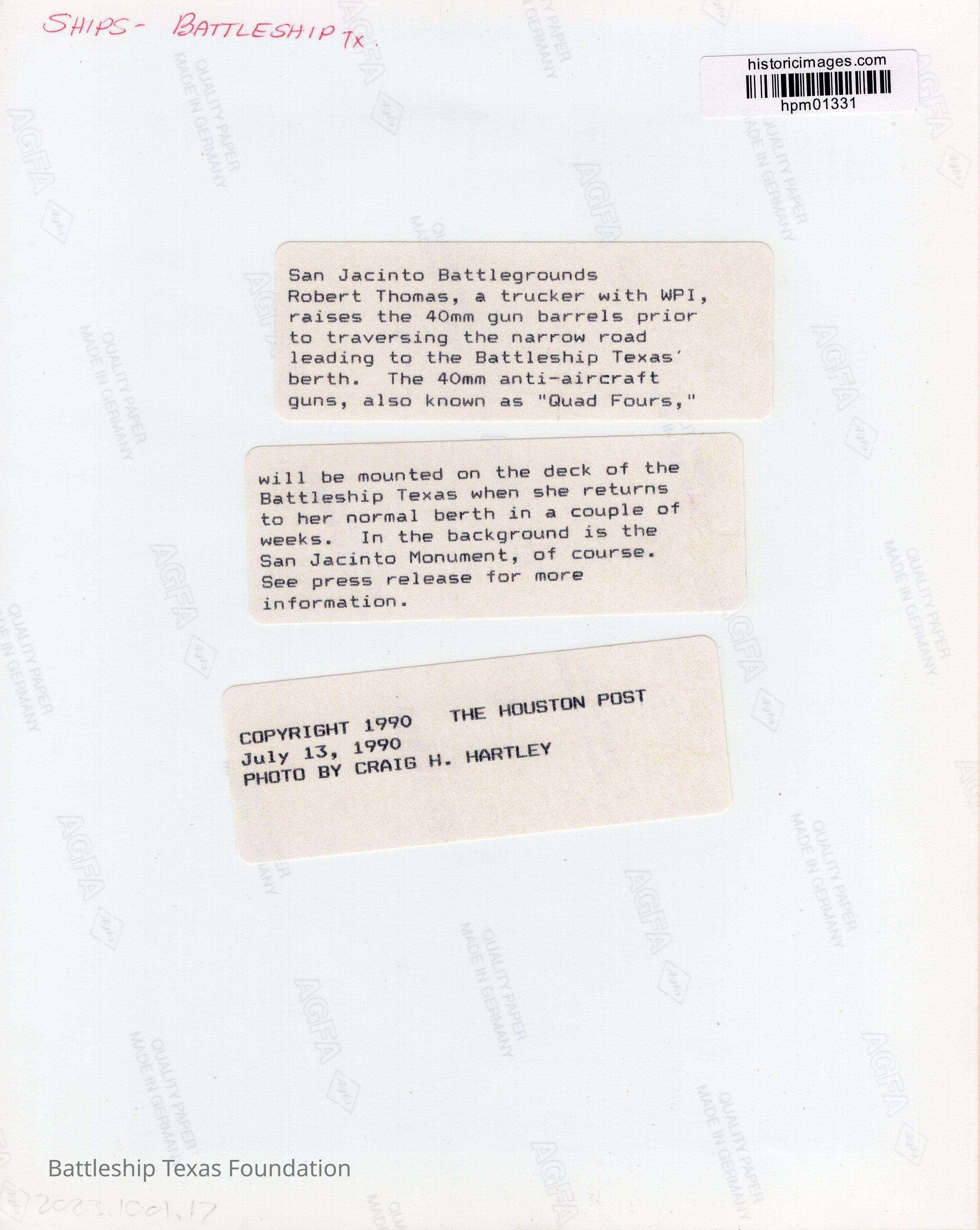 "San Jacinto Battlegrounds Robert Thomas, a trucker with WPI, raises the 40mm gun barrels prior to traversing the narrow road leading to Battleship Texas..."Context