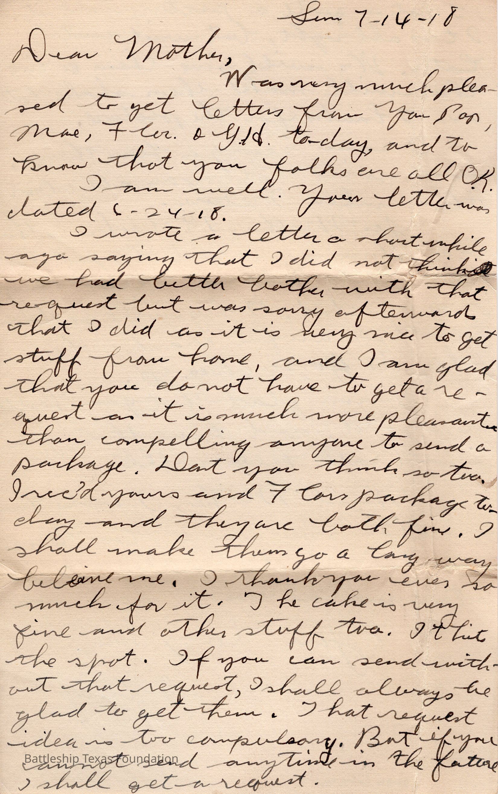 John Lamson was a MM1c on Battleship Texas from May 1917 to June 1919. Throughout his time on Texas, he sent a letter to his family at least once a week, often more. Longer stretches of absence are explained either by movement across the Atlantic, or with the Grand Fleet.