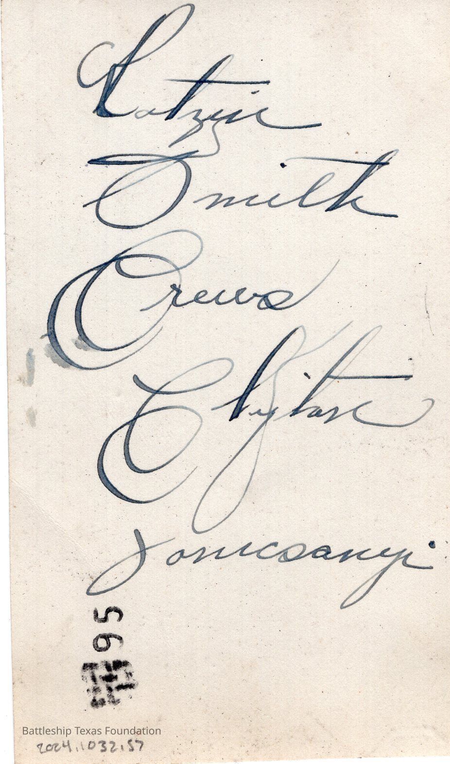 From a donated collection of individual photographs and pages out of a 1930s Texas crewmember's photo album. Items donated by the Los Angeles Maritime Museum. Many photographs had writing on the pages of the book, now discarded. The caption formerly on the page for this photo read,