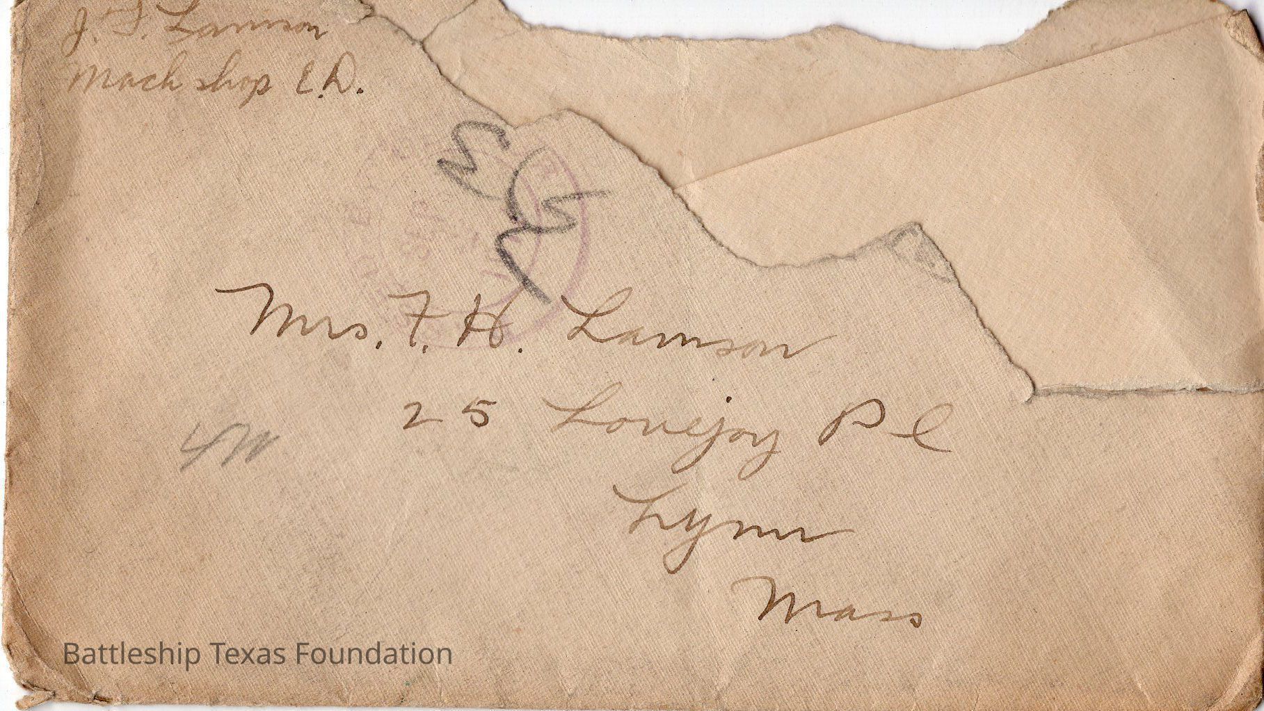 Stamped "PASSED BY CENSOR SEP 4 1917" and "USS Texas" written on back of envelope.Context