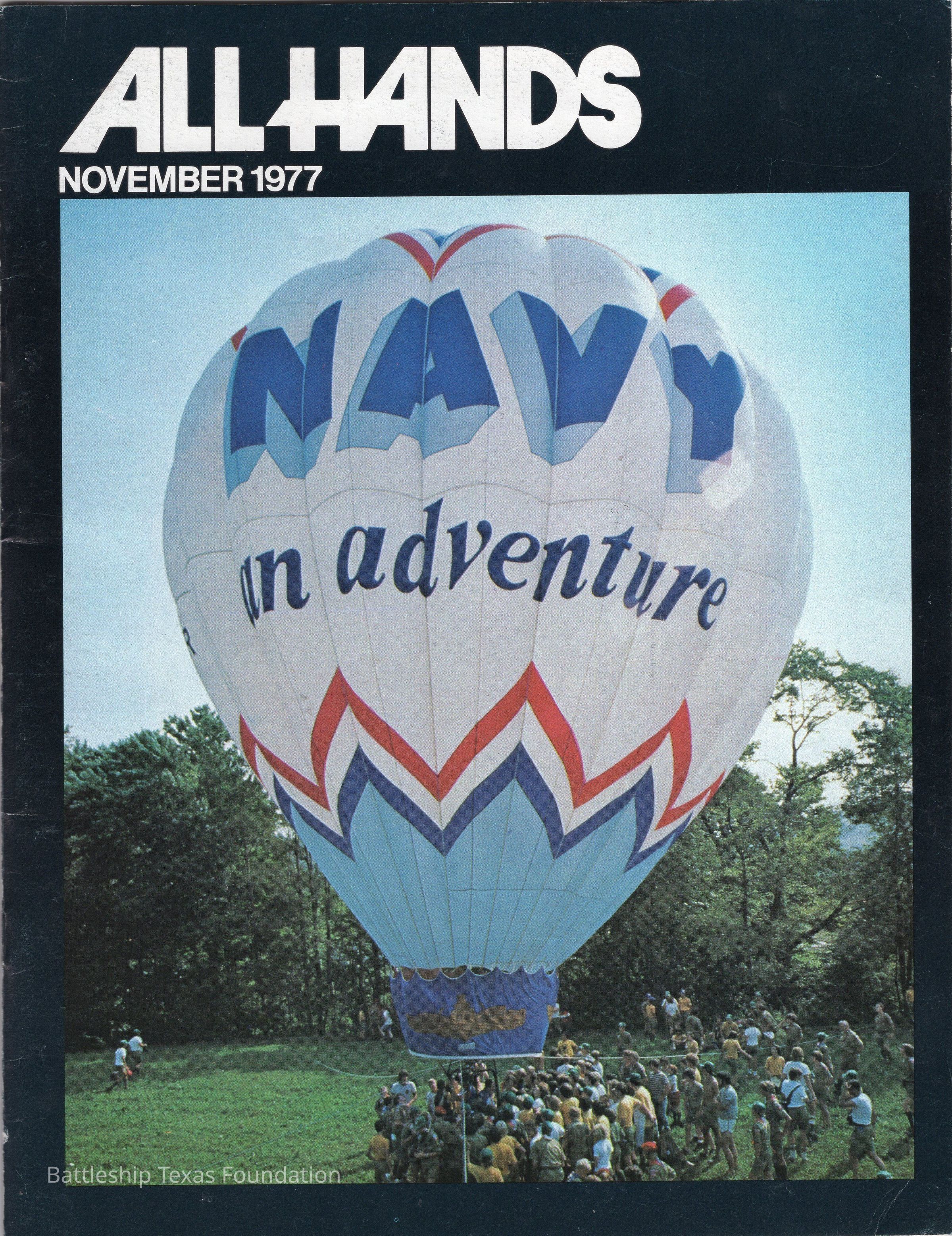 All Hands magazine for November 1977 features a hot air balloon on the cover, and an image of Cruiser Texas on the back. From pages 23-25, there are two articles about USS Texas. The first “When it comes to Texas: They do it Big” is of the new Crusier Texas, and the second “USS Texas Museum” is of the Battleship Texas.Context