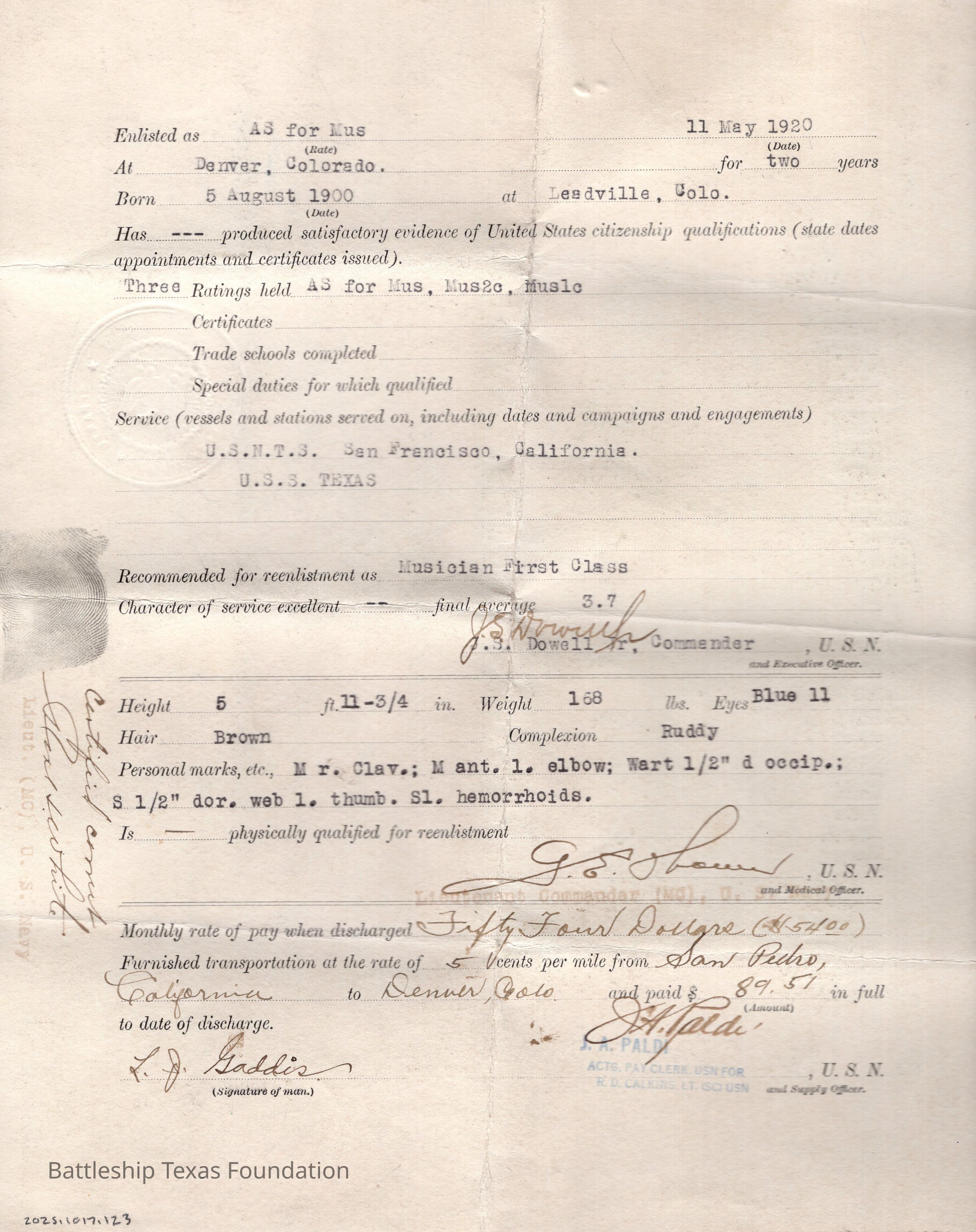 Lawrence James Gaddis's Honorable Discharge certificate awarded on USS Texas on May 10, 1922.Context