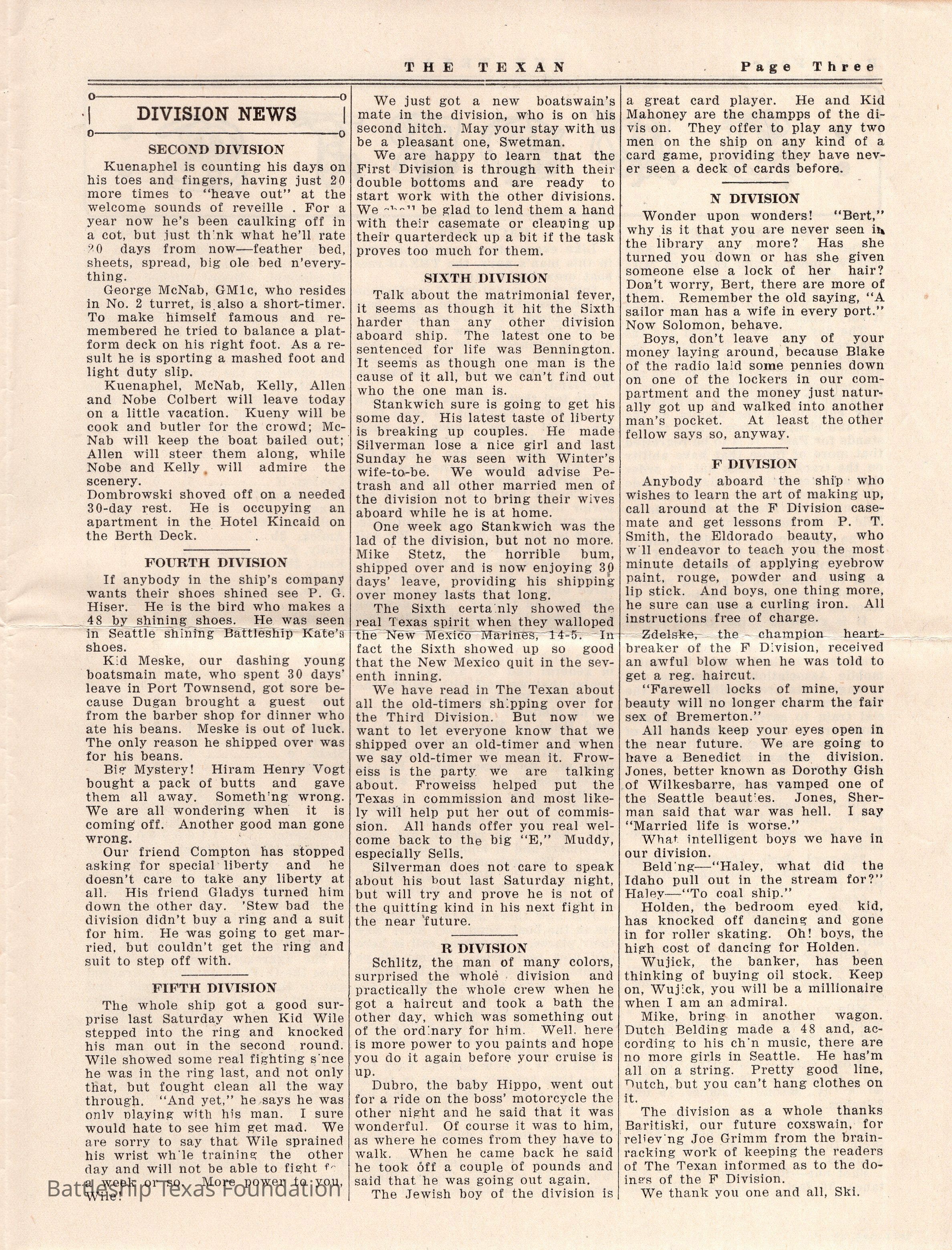 “The Texan” was a weekly newspaper, started in 1920, and published by the crew of Battleship Texas. The paper was published until 1923, running a total of four volumes, with special issues into 1924.Collection