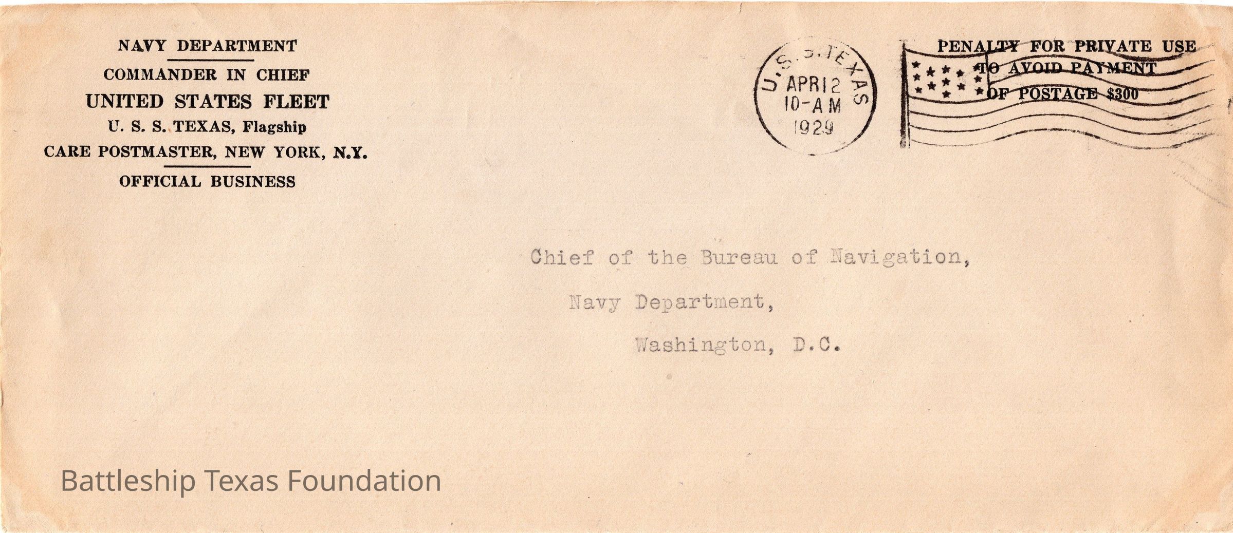 Addressed to Chief of the Bureau of Navigation, Navy Department from Commander in Chief of the US Fleet. Envelope sent from USS Texas on the morning of April 12, 1929, from New York City.Context