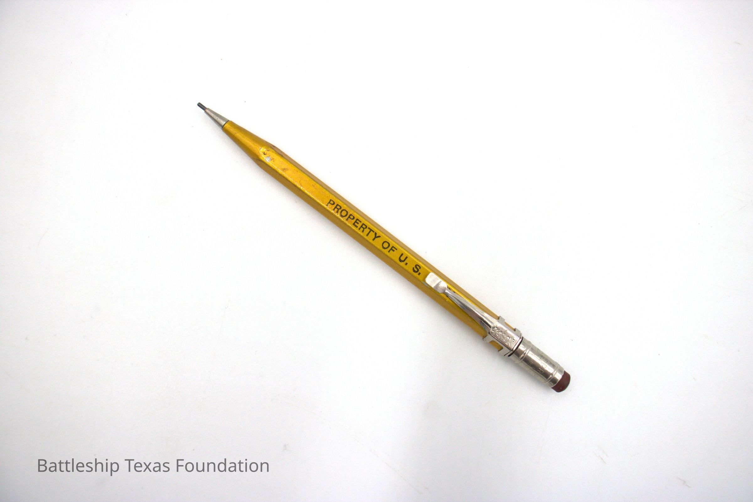 Yellow mechanical pencil owned by Charles Pratt with "PROPERTY OF U.S. NAVY" lettering on the side. Pencil was stored in bicorne hat box.Context