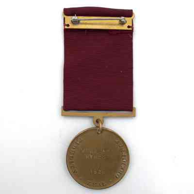 Medal awarded to William Hynes in 1925. Red fabric with USS Constitution circled in rope.Context