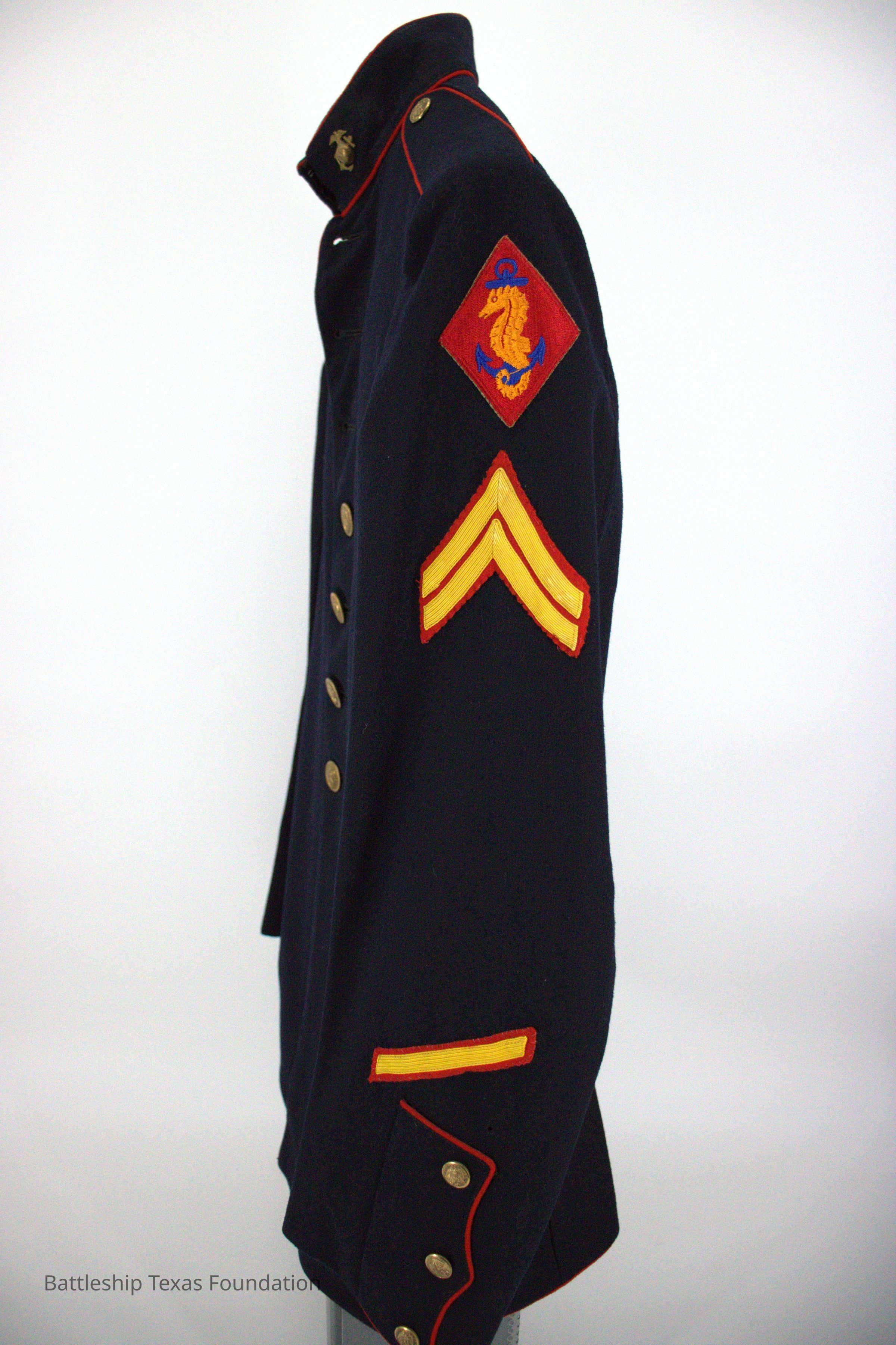 Marine Corps uniform owned by Harold E. Nichols Jr. Both EGAs are present with the top three buttons missing. Both arms have Marine Ship Detachment patch.Context