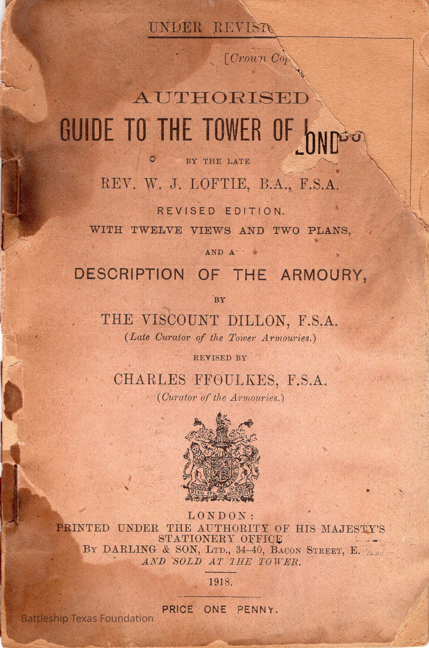 Book guide to the Tower of London written and revised by multiple authors and published in 1918. Covere torn in top right, with inside pages also degraded. Back cover missing.Context