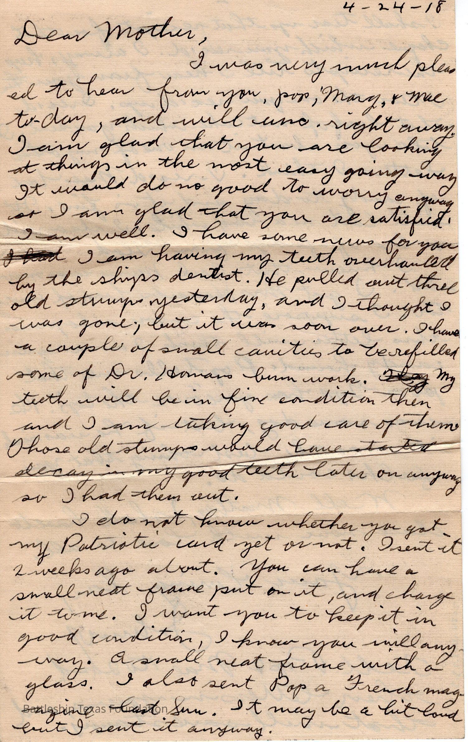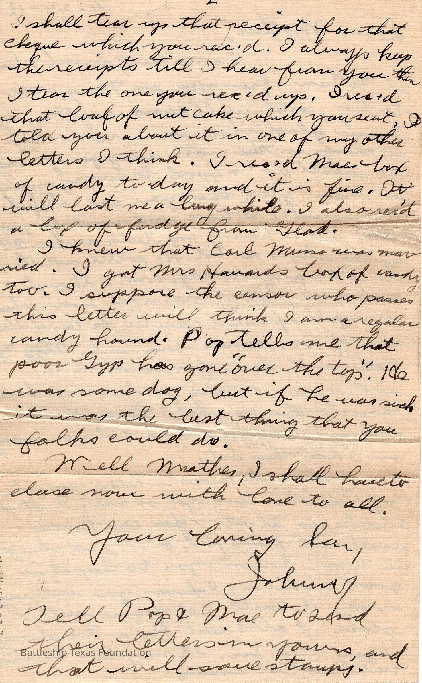 John Lamson was a MM1c on Battleship Texas from May 1917 to June 1919. Throughout his time on Texas, he sent a letter to his family at least once a week, often more. Longer stretches of absence are explained either by movement across the Atlantic, or with the Grand Fleet.