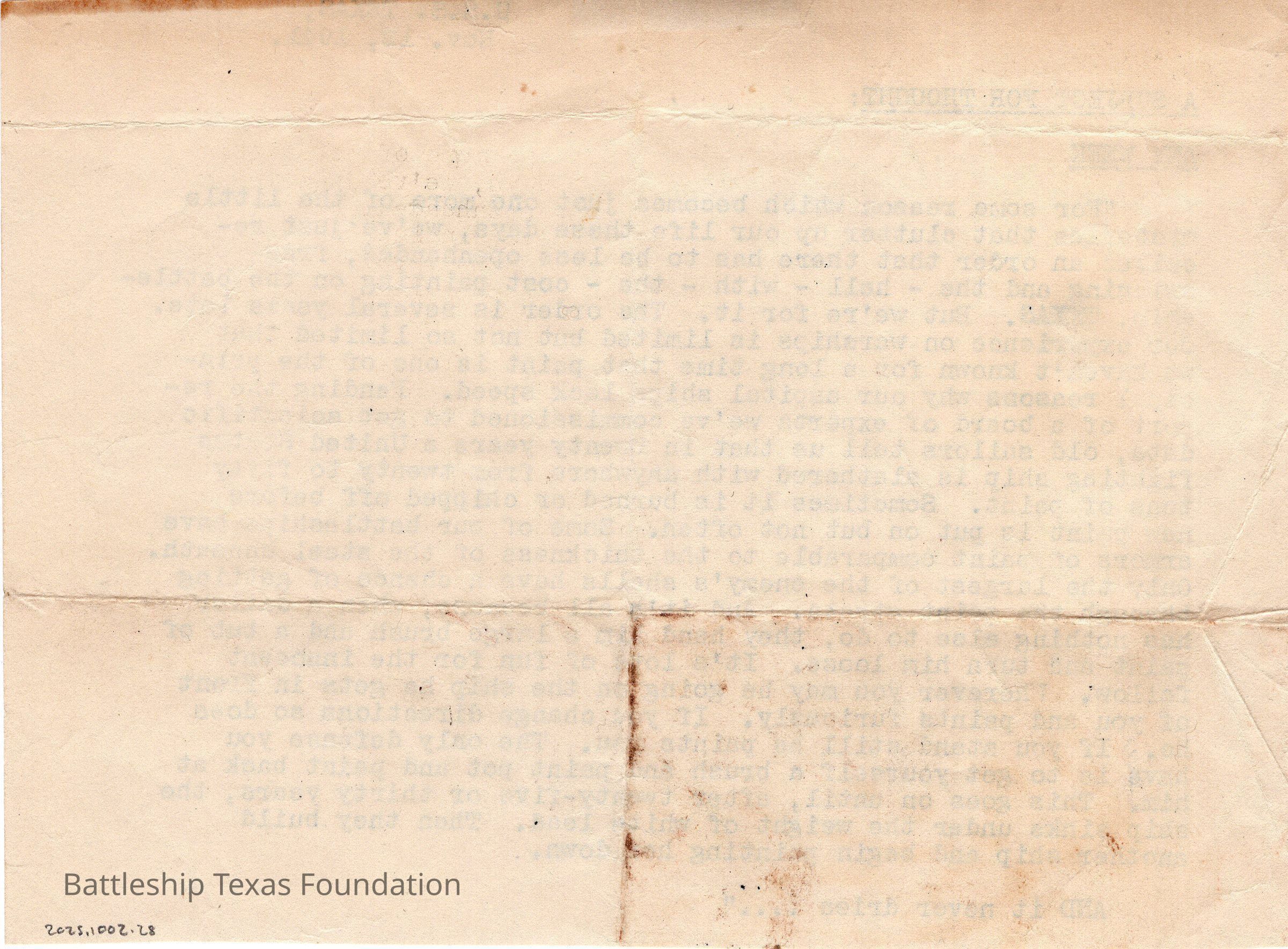 Howard F. Flood Jr. enlisted in the Naval Reserves with parent permission on February 14, 1941, and went through basic training from July 5 to August 3. He went to additional schooling through September 3. His first assignment was on Battleship Texas through March 1942.Collection
