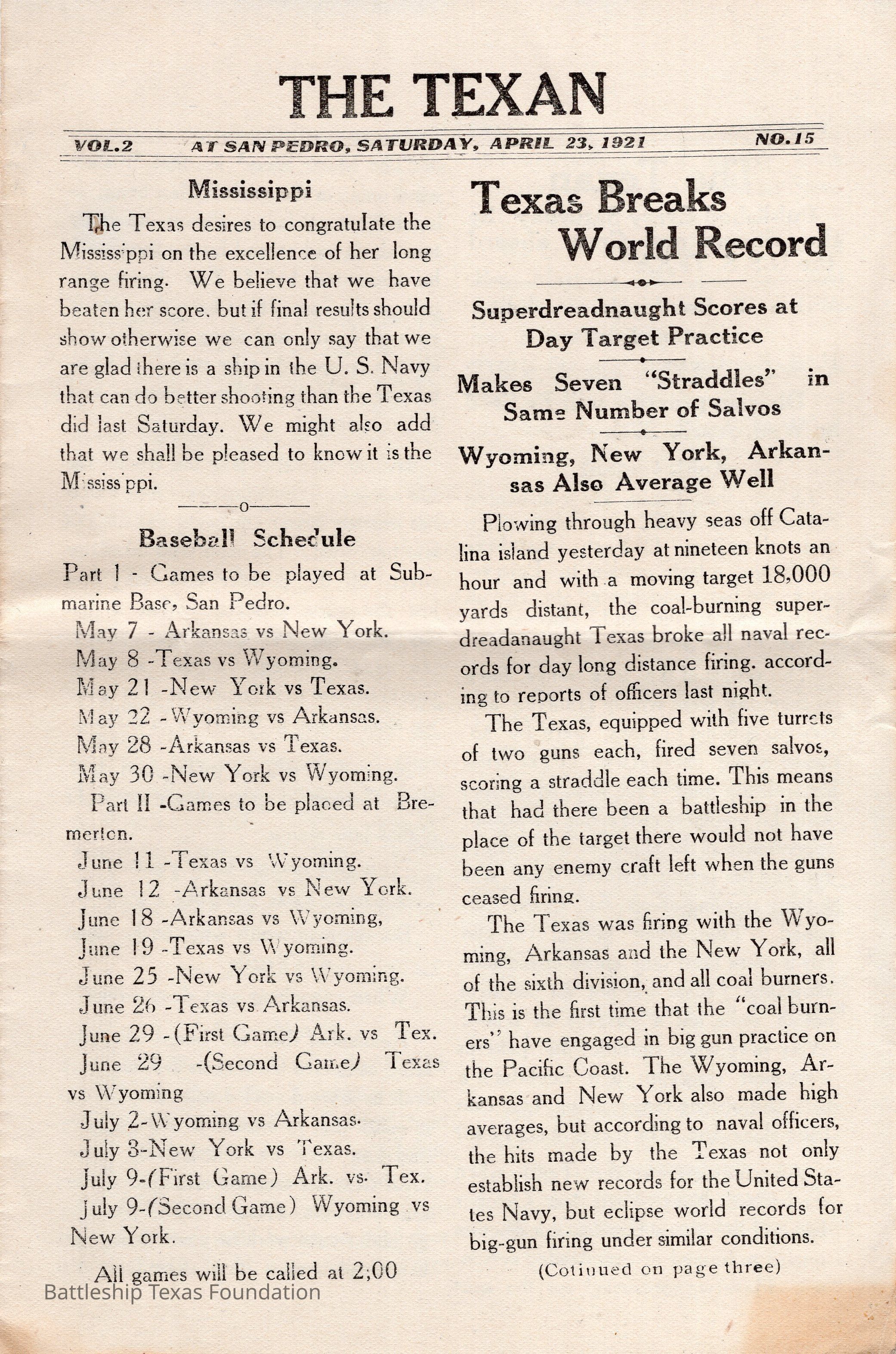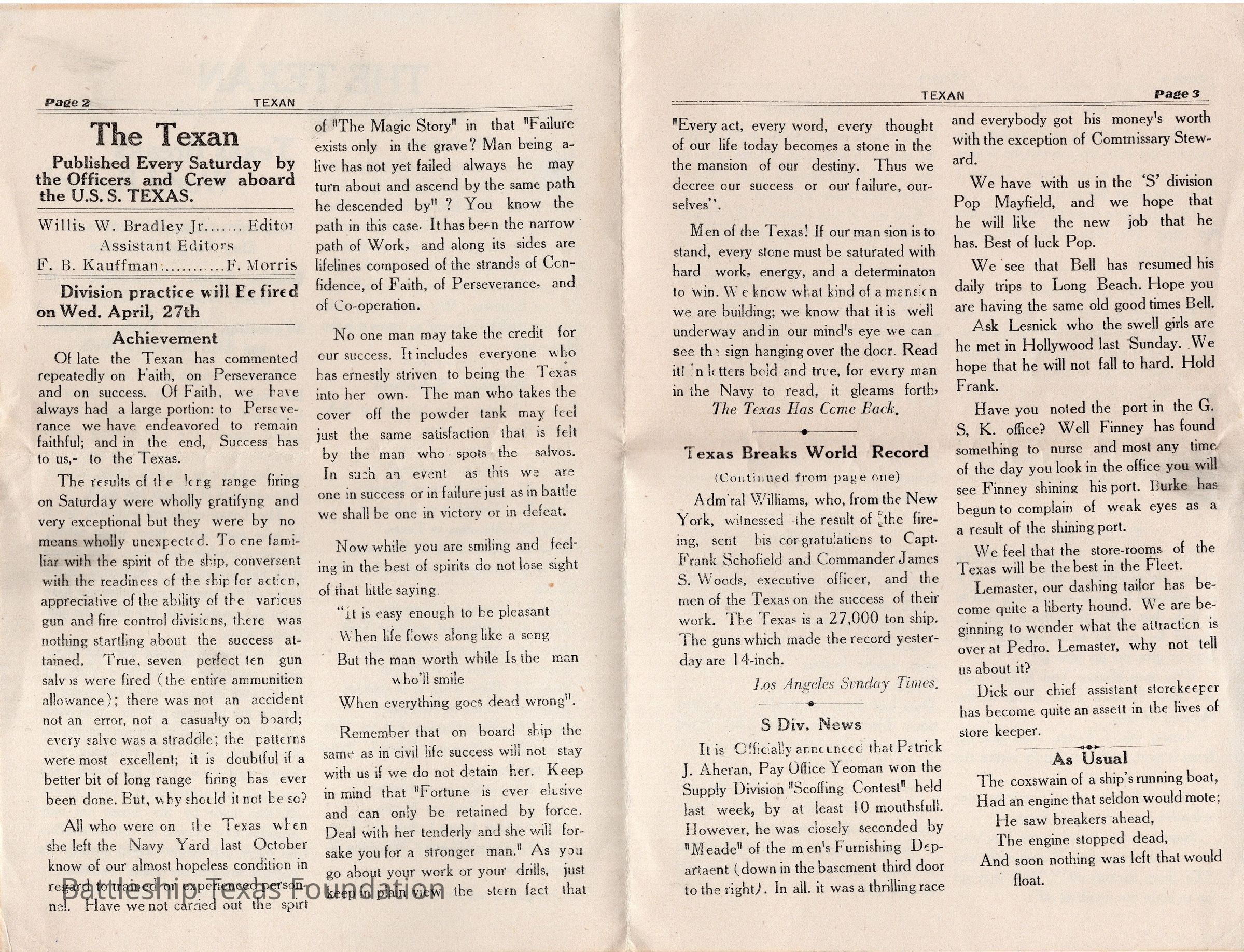 “The Texan” was a weekly newspaper, started in 1920, and published by the crew of Battleship Texas. The paper was published until 1923, running a total of four volumes, with special issues into 1924.Collection