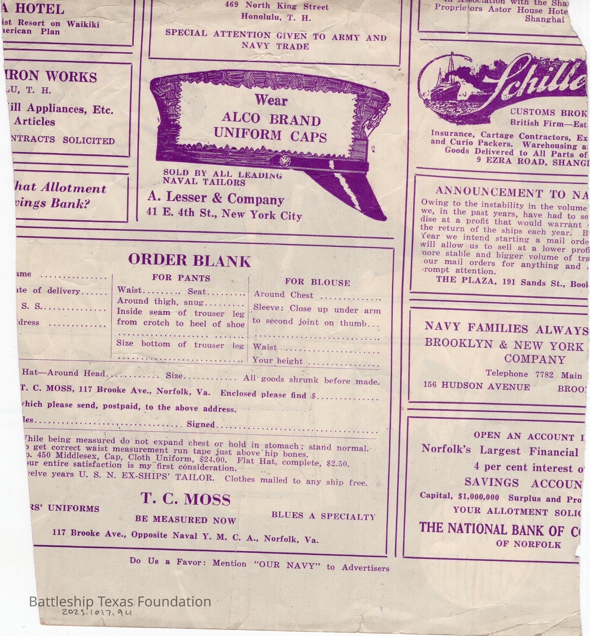 Lawrence Gaddis collected many souvenirs during his travels around North and South America, as well as from events held on the ship or by the crew, and articles mentioning Battleship Texas in the papers.Collection