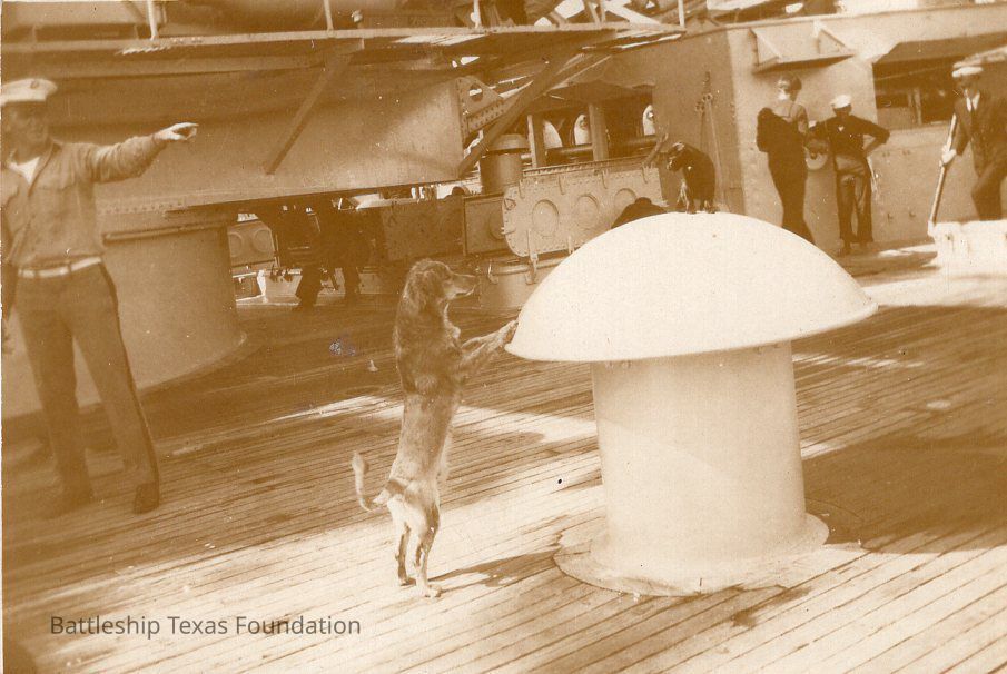 Dog and cat on main deck. Man points to the pair from left of photo. Photo on starboard side by turret #3Context