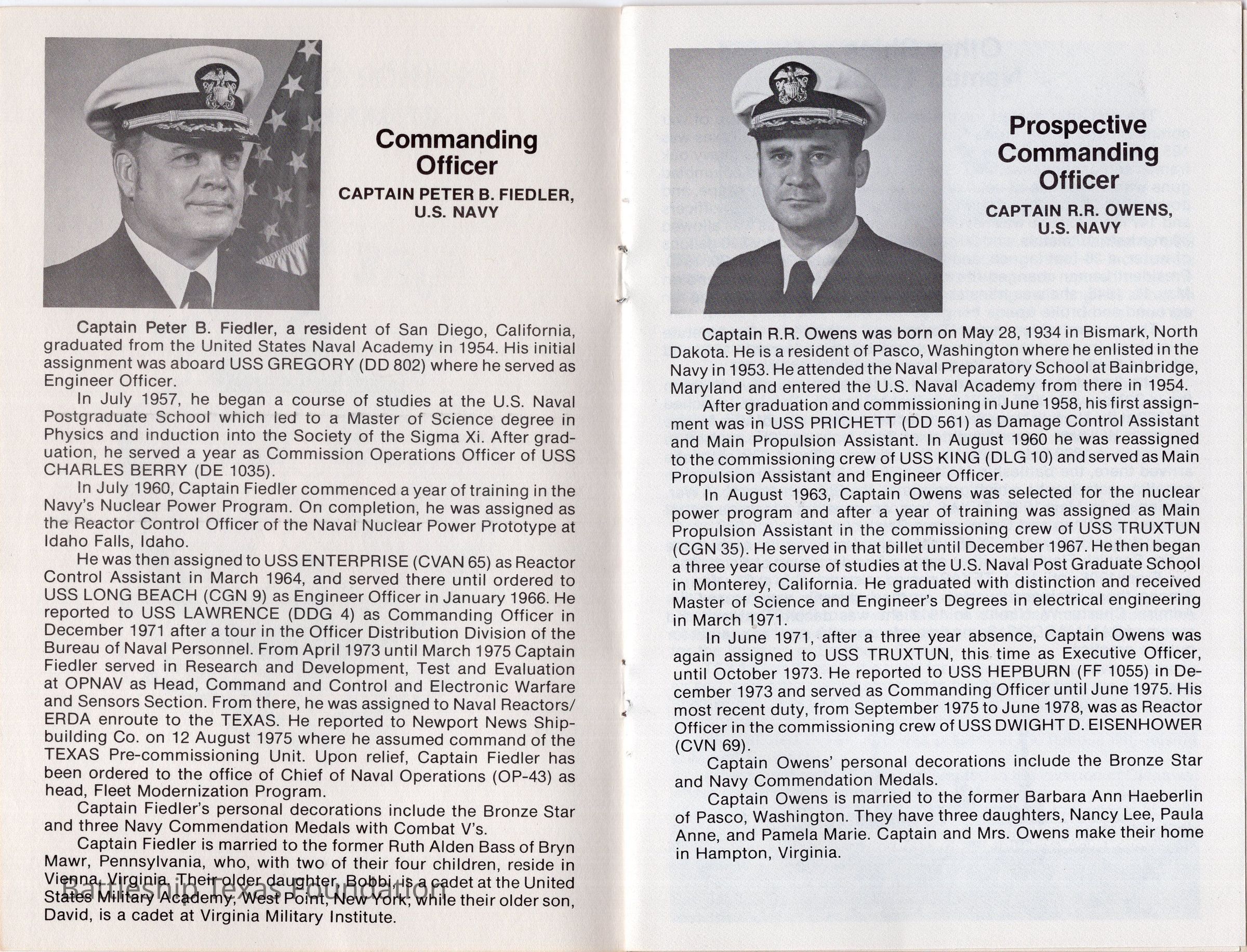 Change of Command pamphlet for Captain Peter Fiedler's relief by Captain R.R. Owens on January 27, 1979. Features biographies of both men, and information on the history of warships named Texas.Context