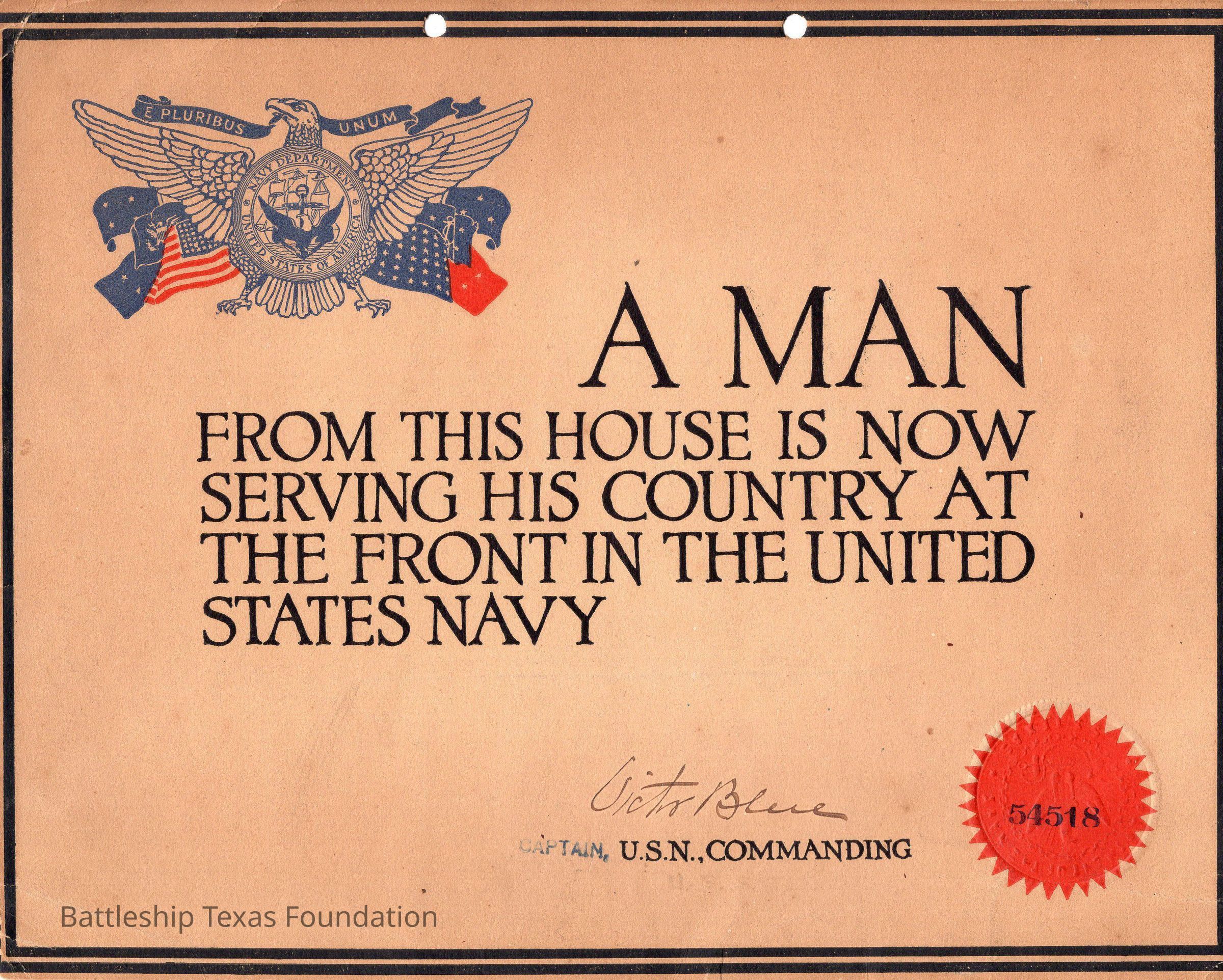 Certificate for the family of servicemembers in the US Navy. Blue crest top left and red stamp bottom rightContext