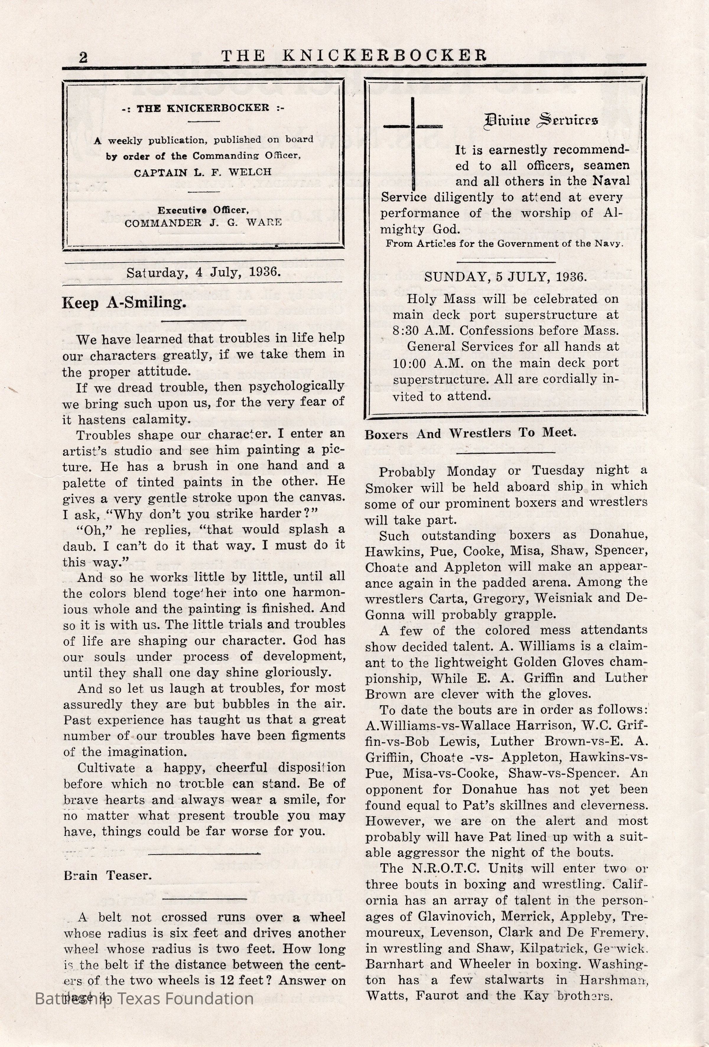 The Knickerbocker was a weekly paper published jointly by the midshipmen and enlisted men of Battleship New York.Collection