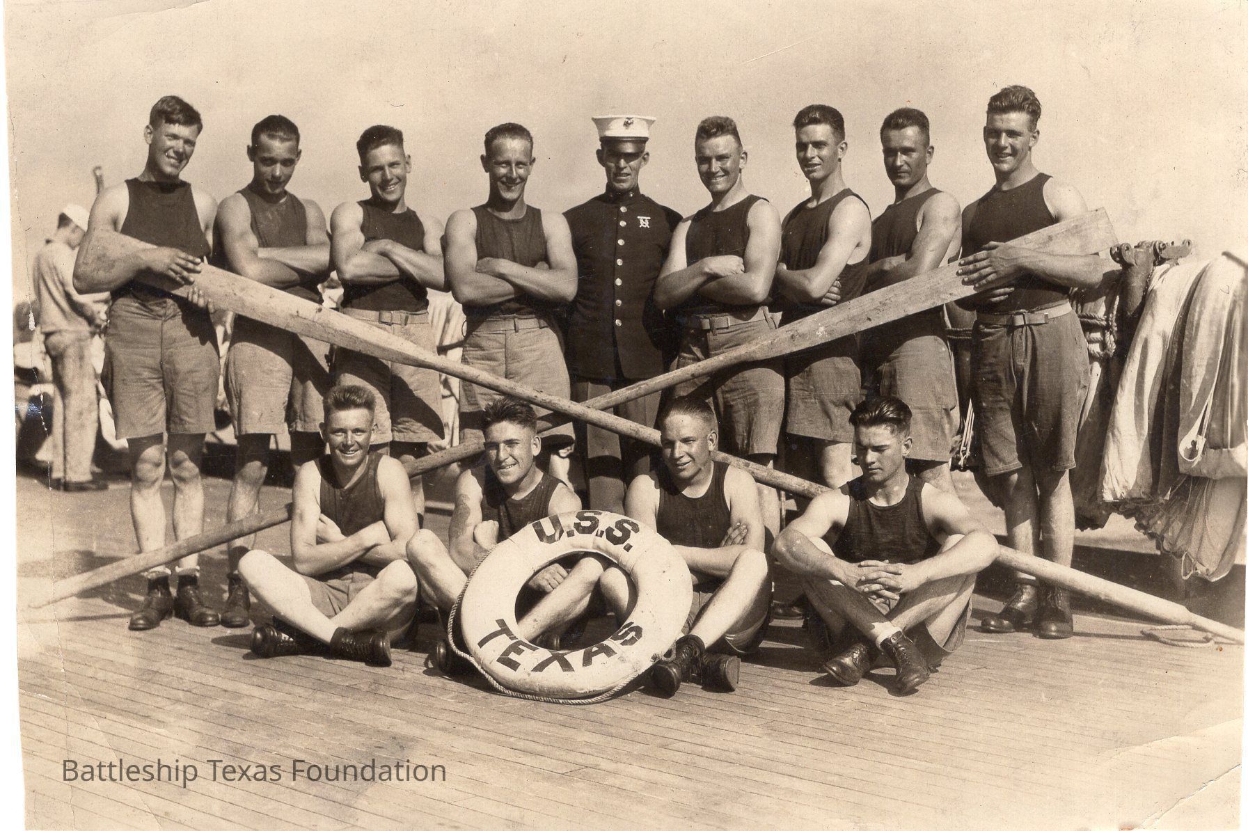 Thirteen men pose with U.S.S. TEXAS life preserver, and a pair of oarsContext