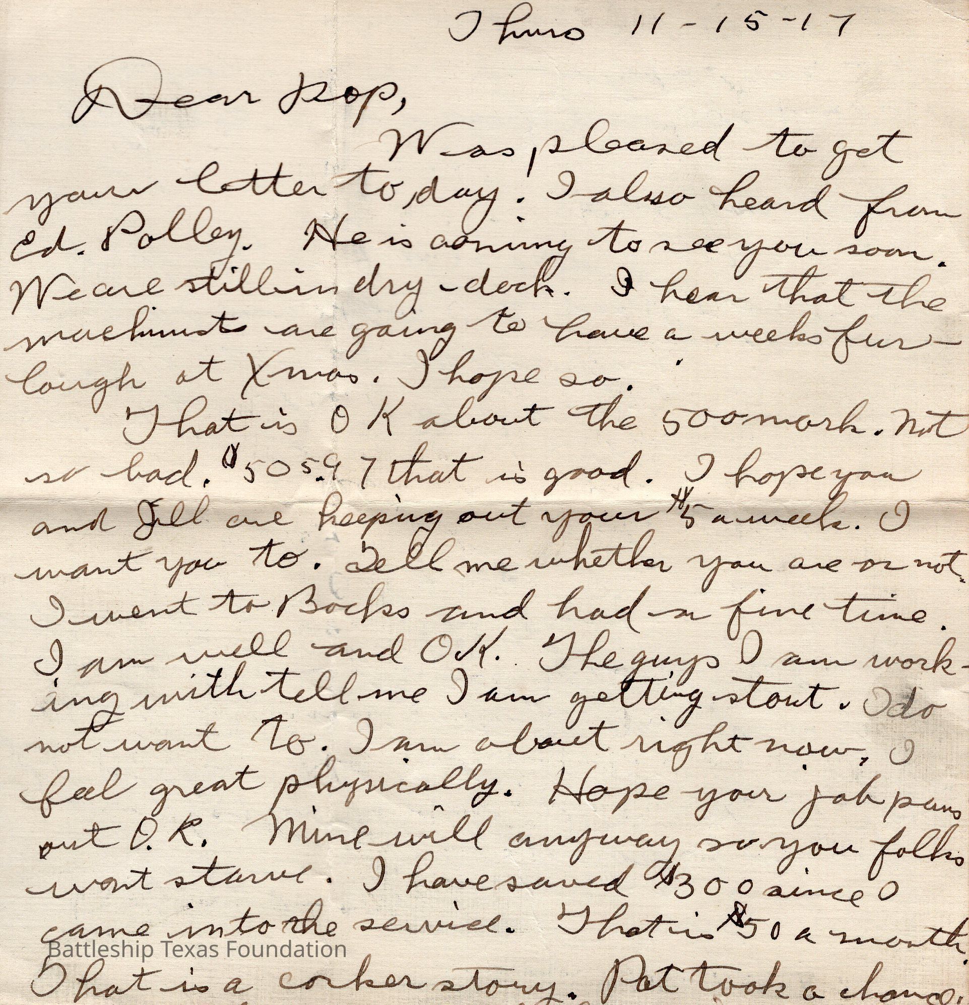 John Lamson was a MM1c on Battleship Texas from May 1917 to June 1919. Throughout his time on Texas, he sent a letter to his family at least once a week, often more. Longer stretches of absence are explained either by movement across the Atlantic, or with the Grand Fleet.