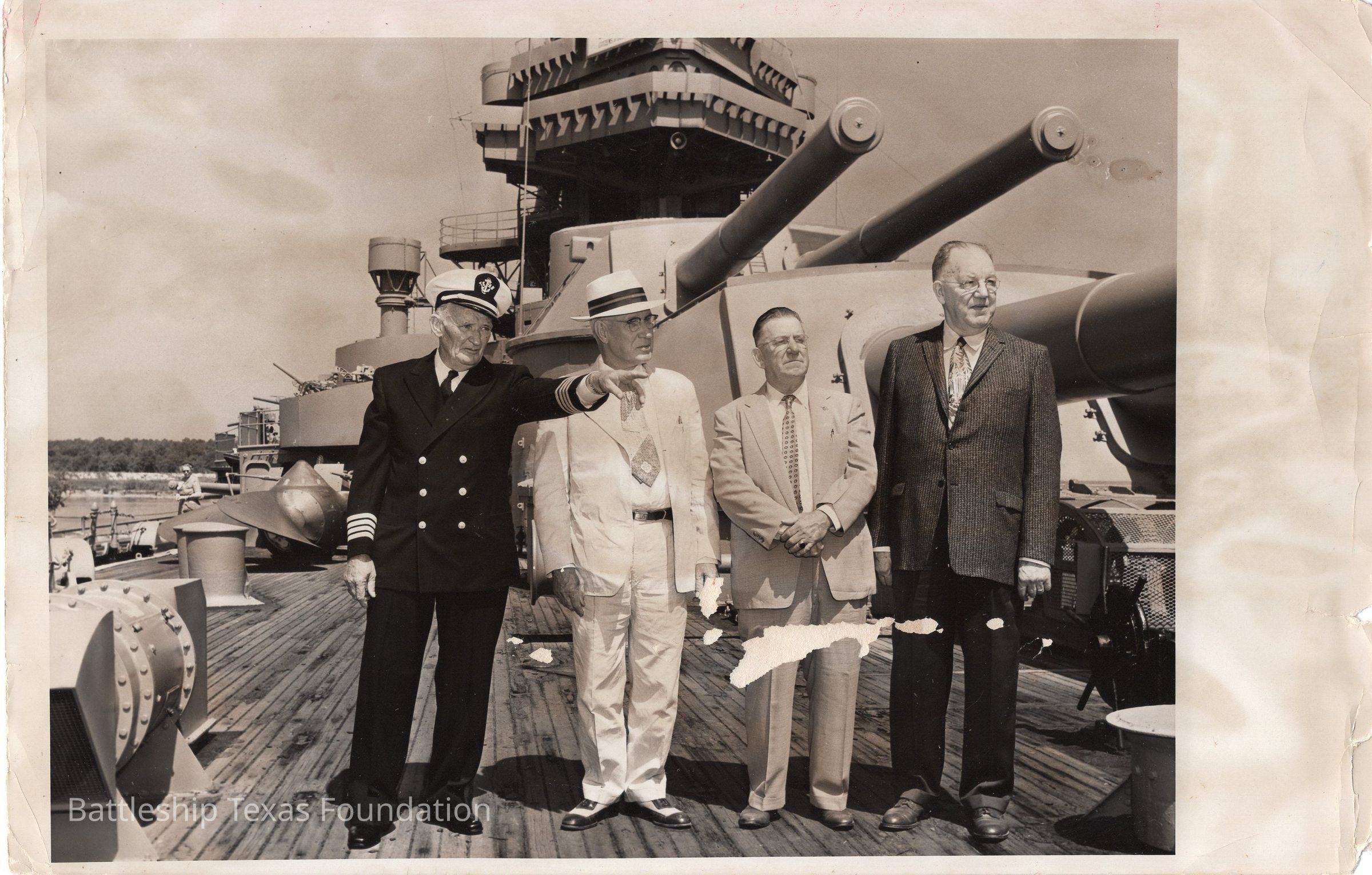 Four crewmembers on the bow of Texas. Left to right: J. McKeown(pointing), Anthony Wust, F. A. Pellerin, O. W. Behrens. Propeller in background behind men. back has written in large letters "San Jacinto Battleground - Houston - 1958"Context