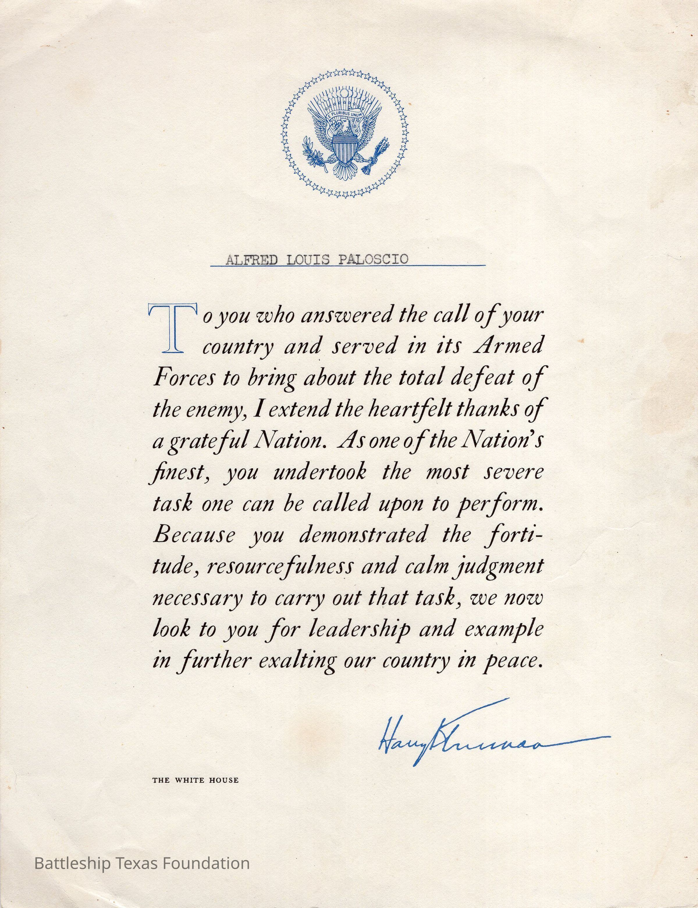 Certificate honoring Paloscio's service during WWII.