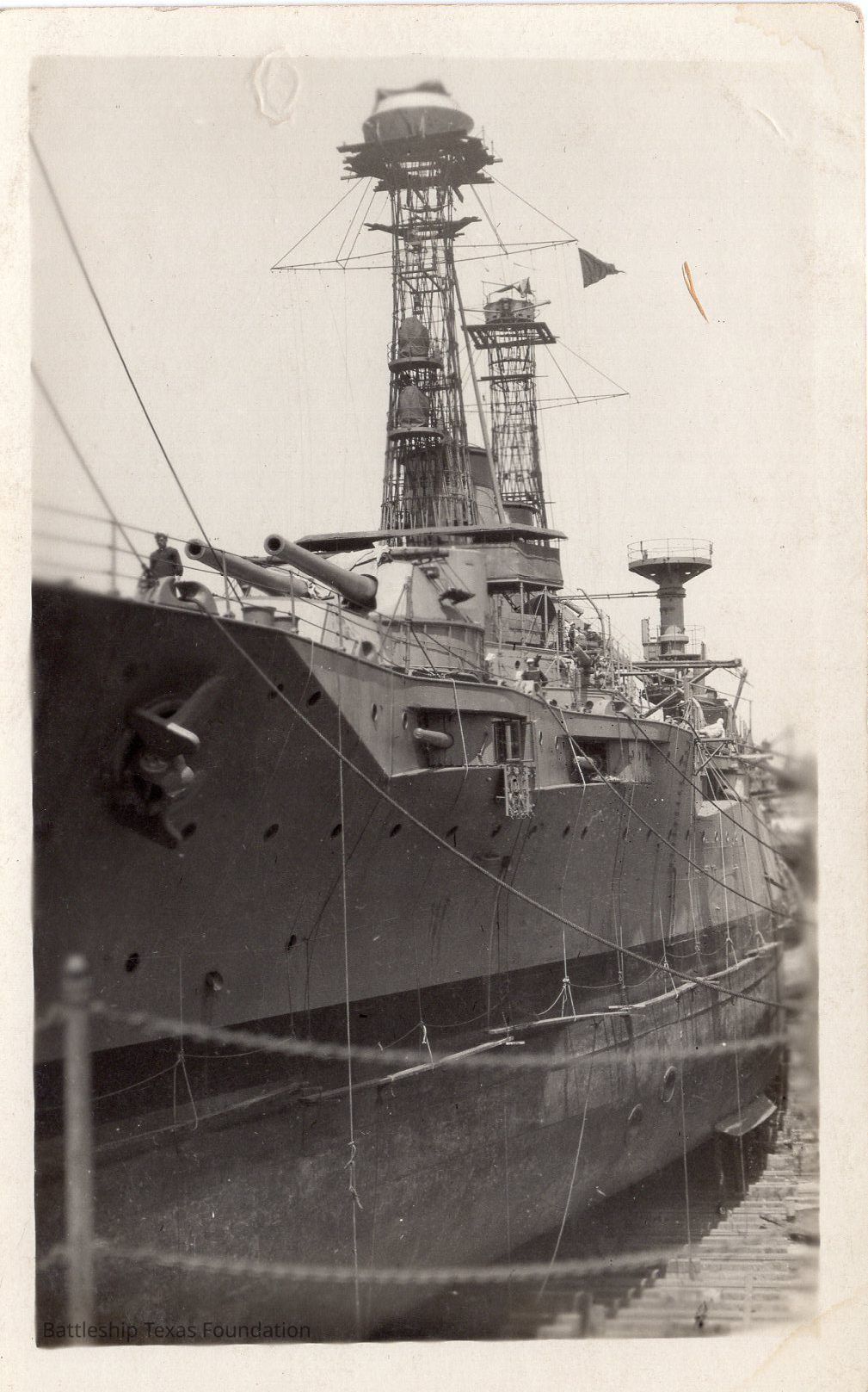 Texas with cage masts in dry dock. Photo of portside of ship. Bridge is just canvas cover.Context
