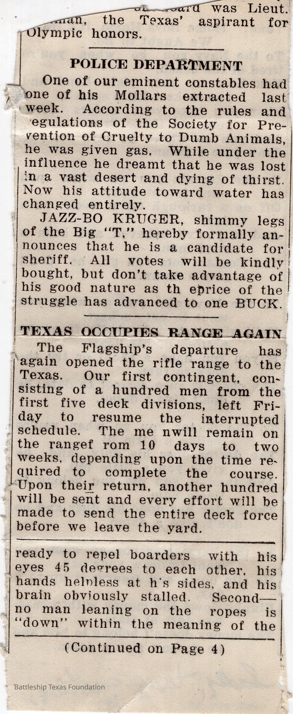 Second article on the front of the clipping is about Texas entering the range. Range referred to the ship's target practice.Context