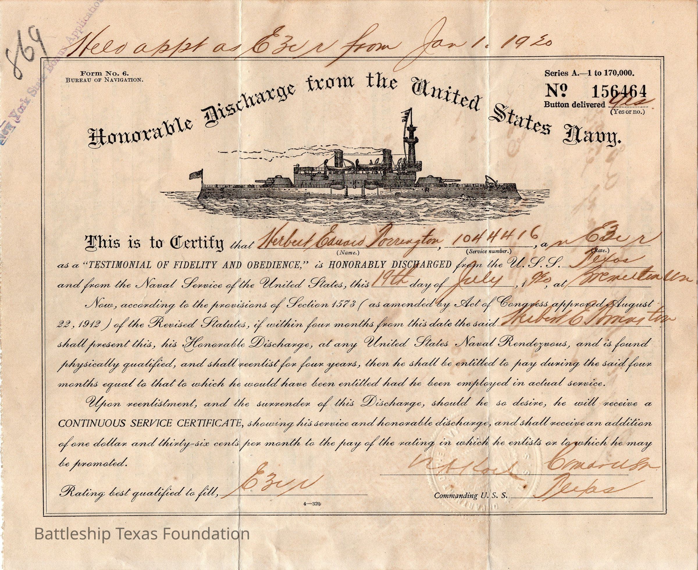 Honorable Discharge from the United States Navy certificate No. 156464 belonging to Howard Torrington (SN 1044416) and awarded on July 19, 1920. Torrignton discharged directly from USS Texas.