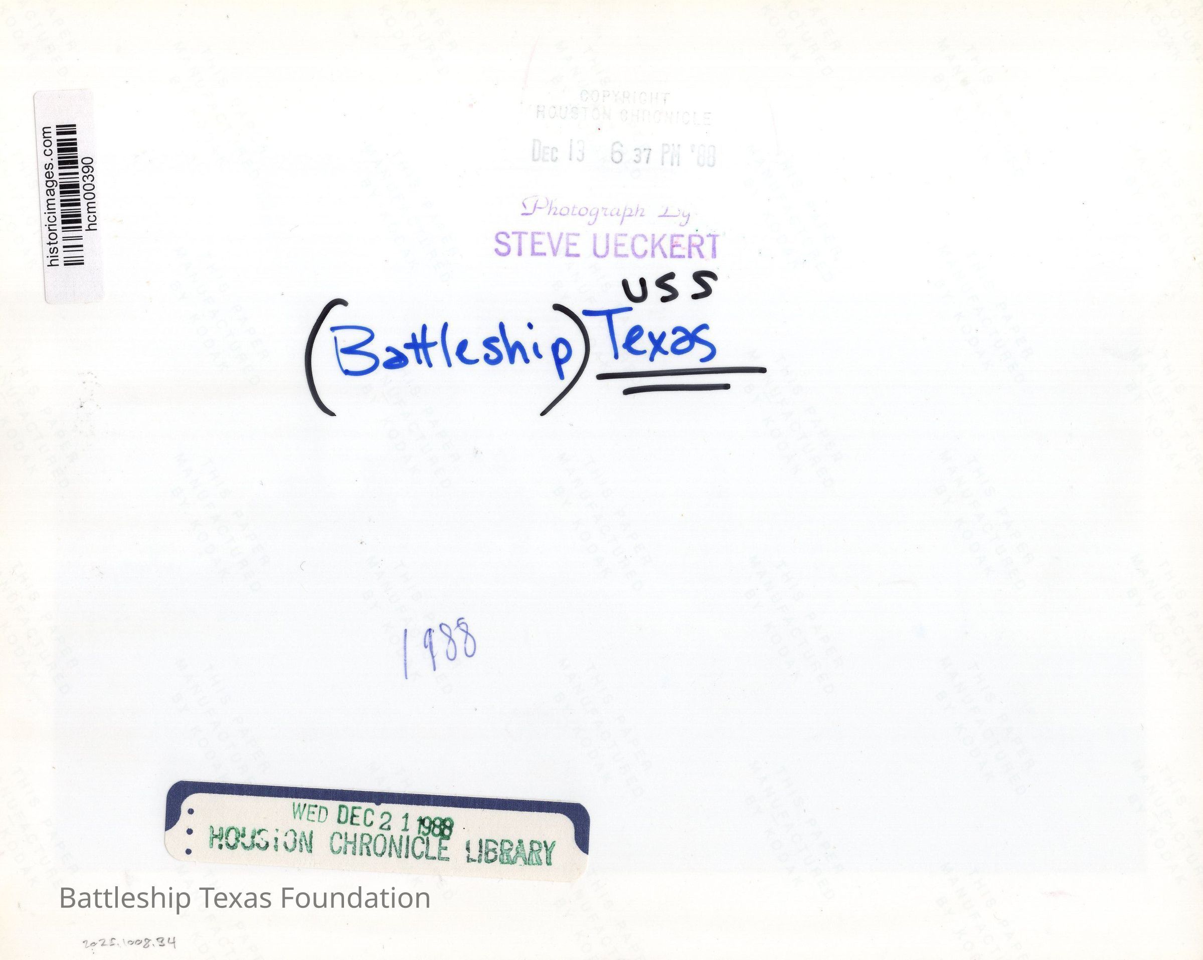 Battleship Texas departed San Jacinto State Park for Todd Shipyard in Galveston where she had hull work in dry dock from December 13, 1988, to August 6, 1989, and then put back in water for additional work through February 23, 1990. She was moved to Green’s Bayou for decking and monopile instillation and returned to San Jacinto Battleground on July 28, 1990. The Battleship Texas Museum was operated by the Texas Parks and Wildlife Department from 1983 to 2020.Collection