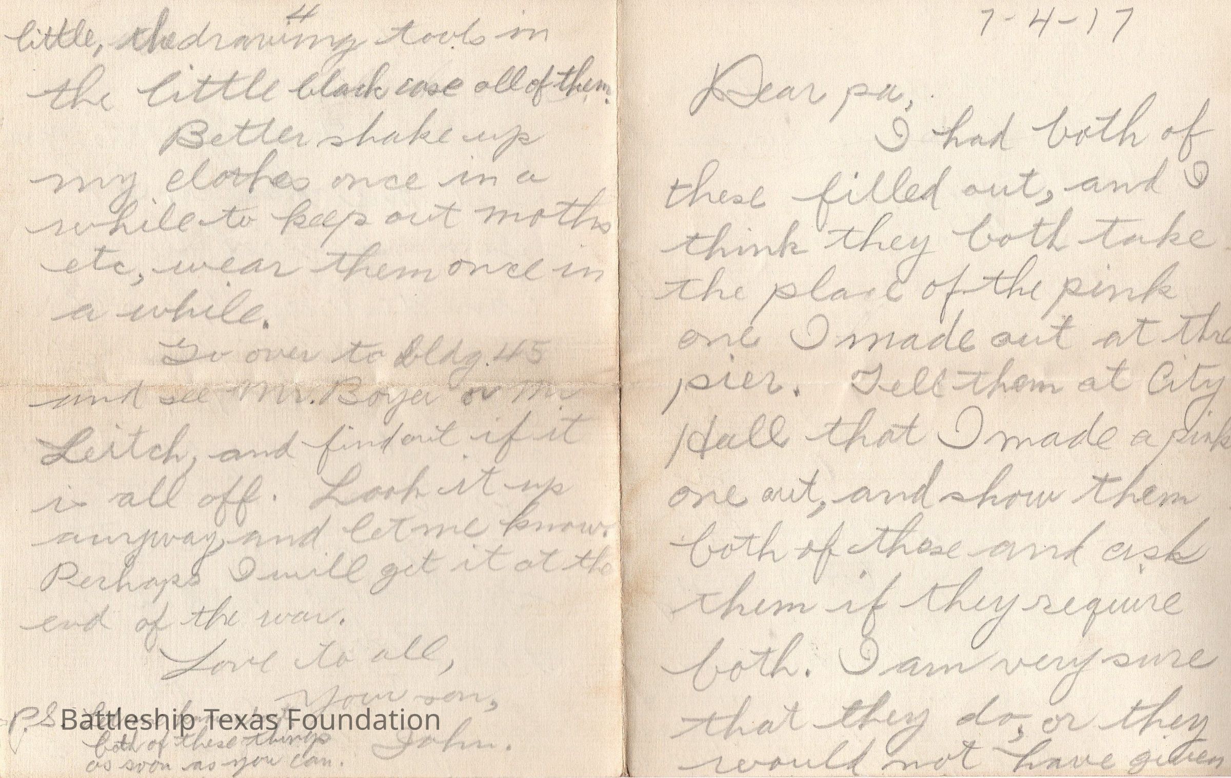 John Lamson was a MM1c on Battleship Texas from May 1917 to June 1919. Throughout his time on Texas, he sent a letter to his family at least once a week, often more. Longer stretches of absence are explained either by movement across the Atlantic, or with the Grand Fleet.