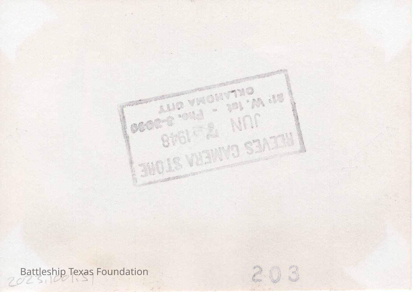 Two men in white shirts stand behind turret #3. Shot looking forward. Back stamped "203" and dated to June 7, 1948.Context