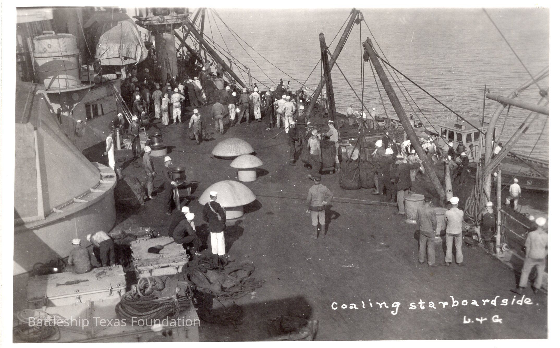 Men move coal on main deck. Several smaller craft over side of Texas. Captioned: