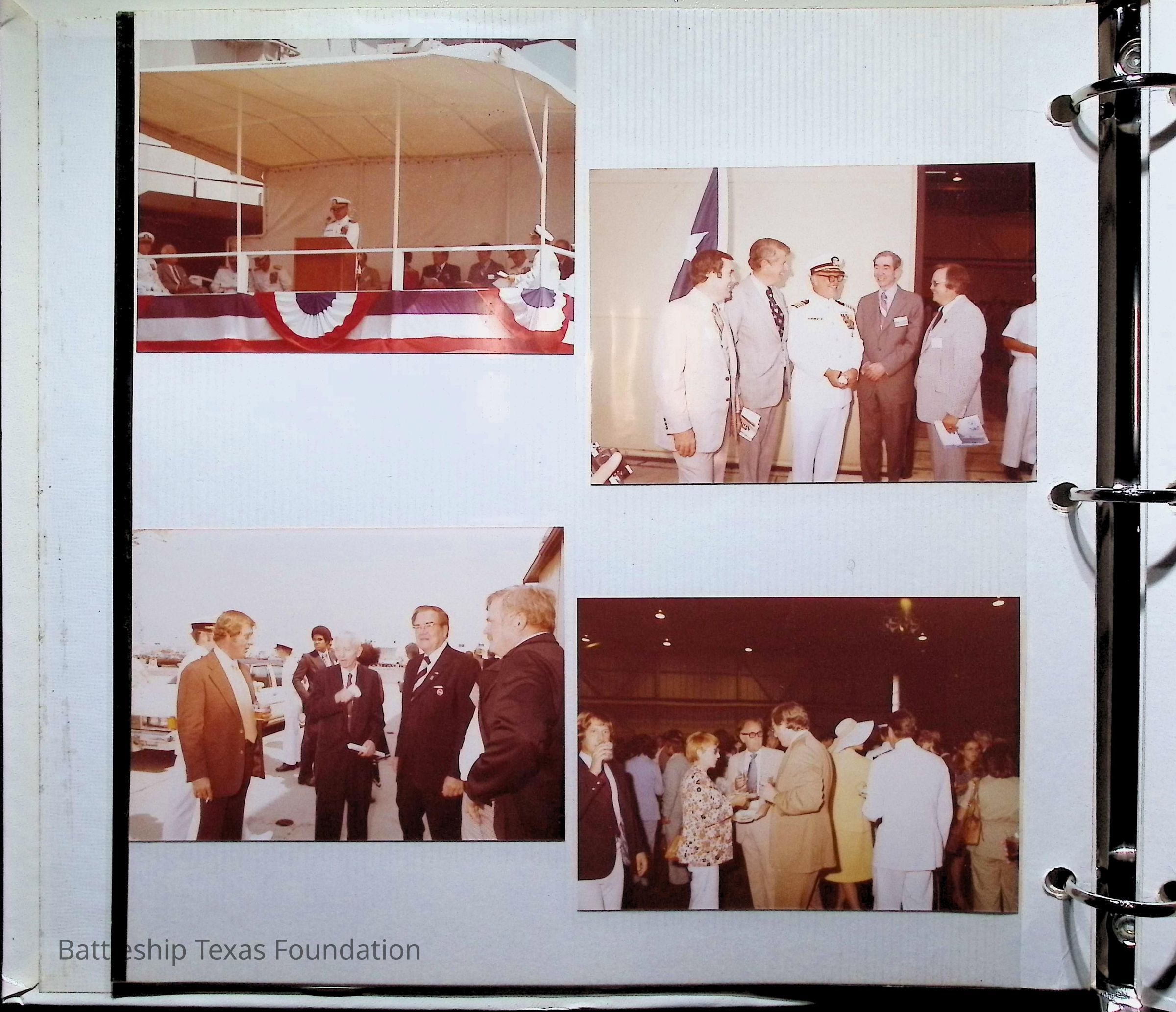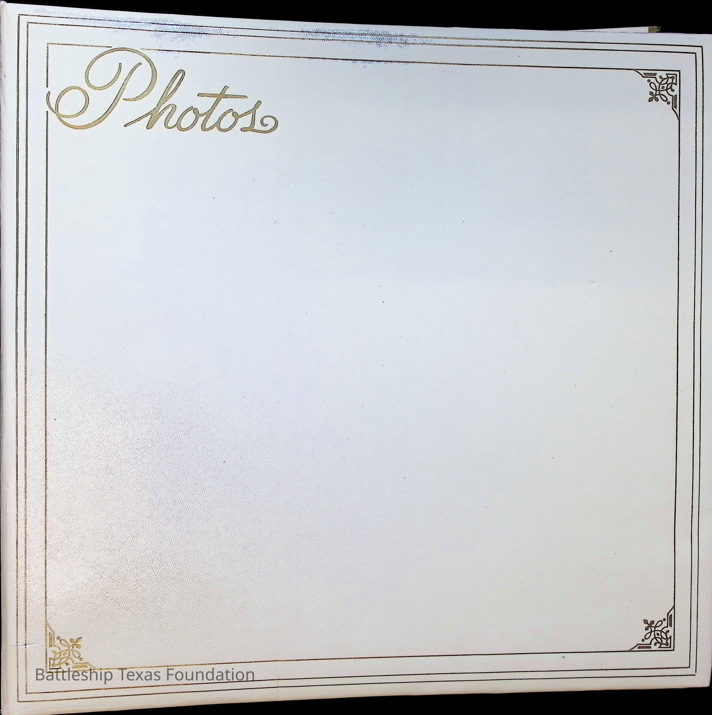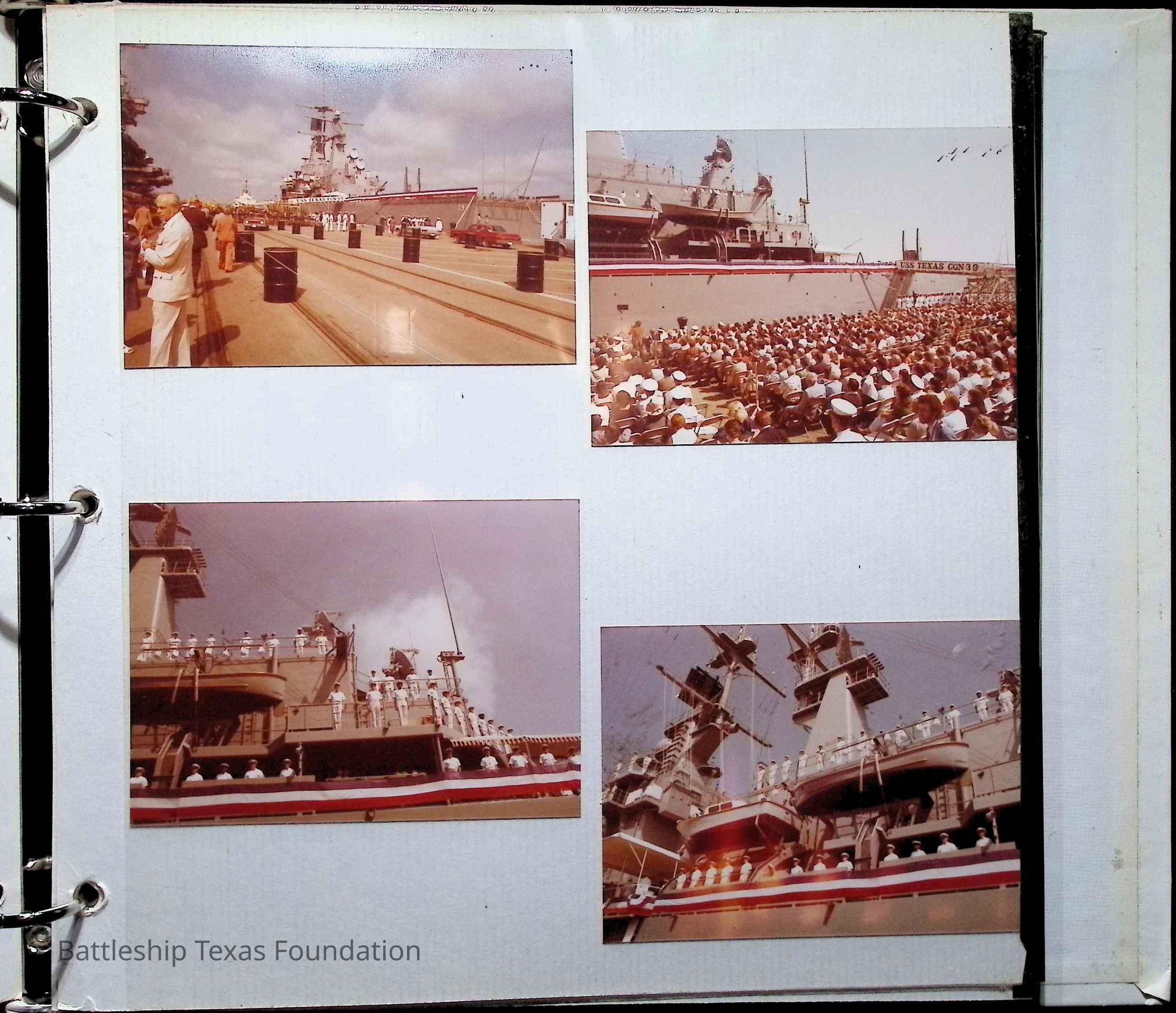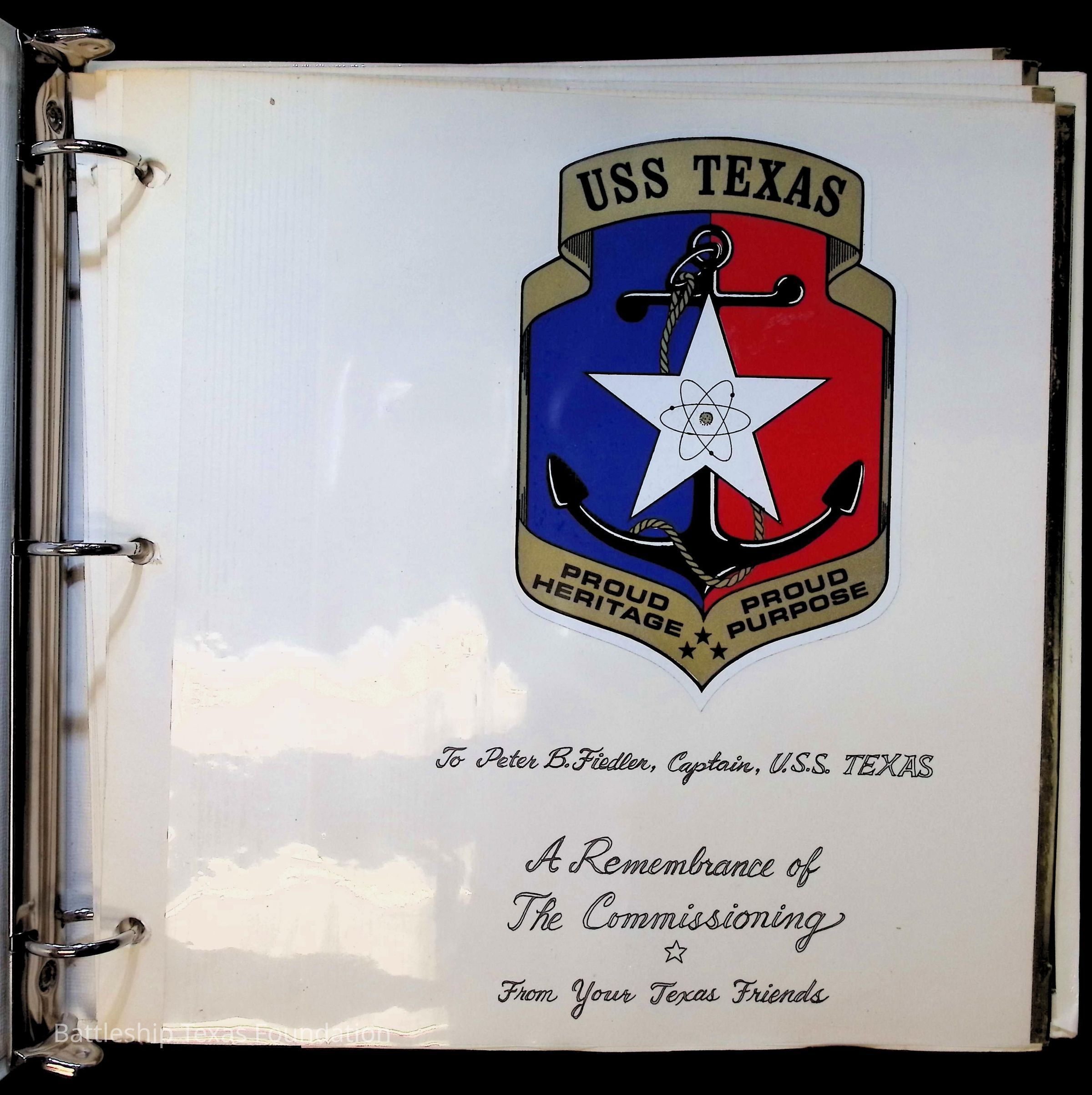 Photo album covering the commissioning of USS Texas (CGN-39). First page titled "A Remembrance of the Commissioning" "From your Texas friends" and presented to Captain Peter B. Fiedler. Only the first thirteen pages are filled, each with varying numbers of photos, totaling forty-three.Context