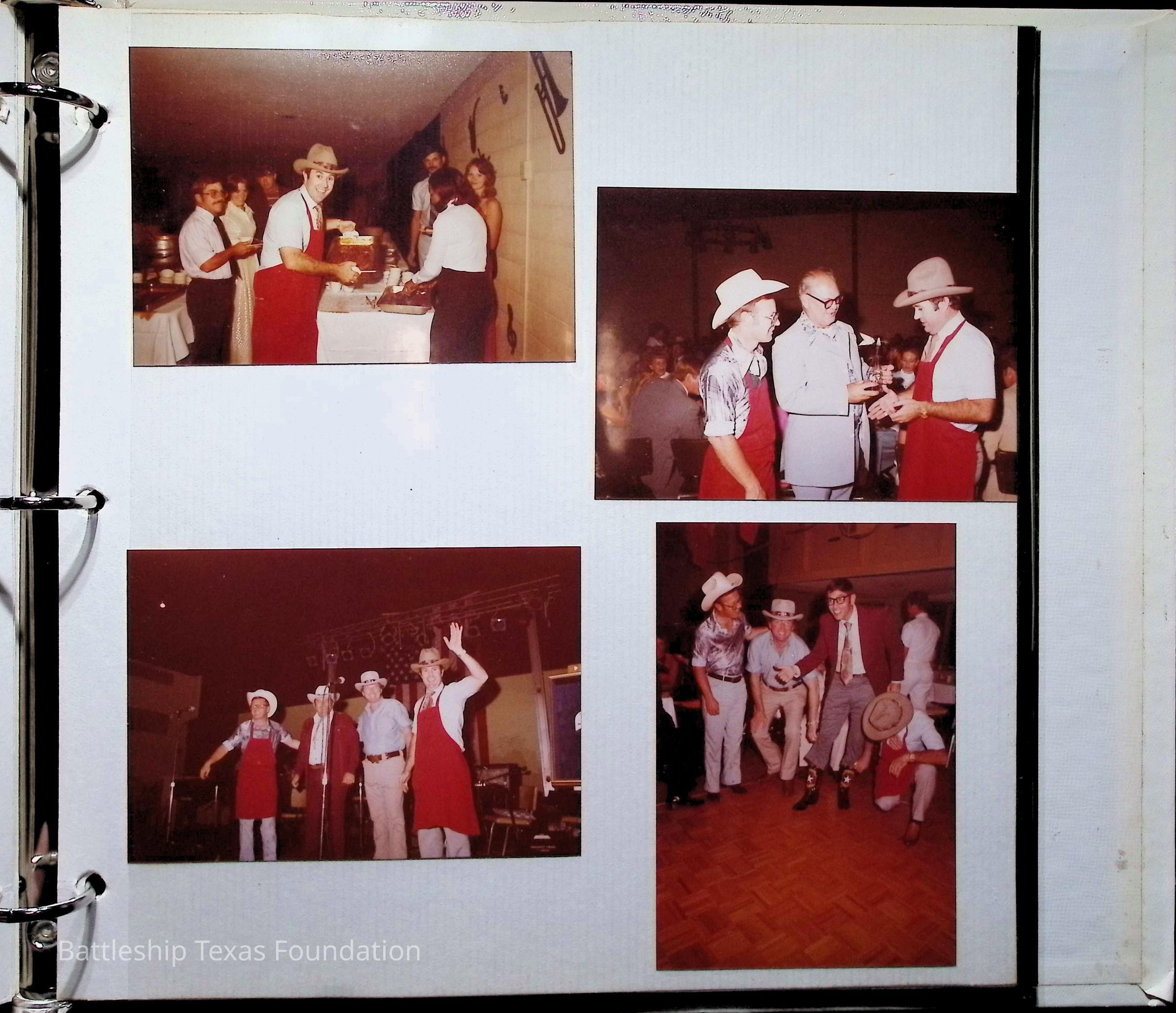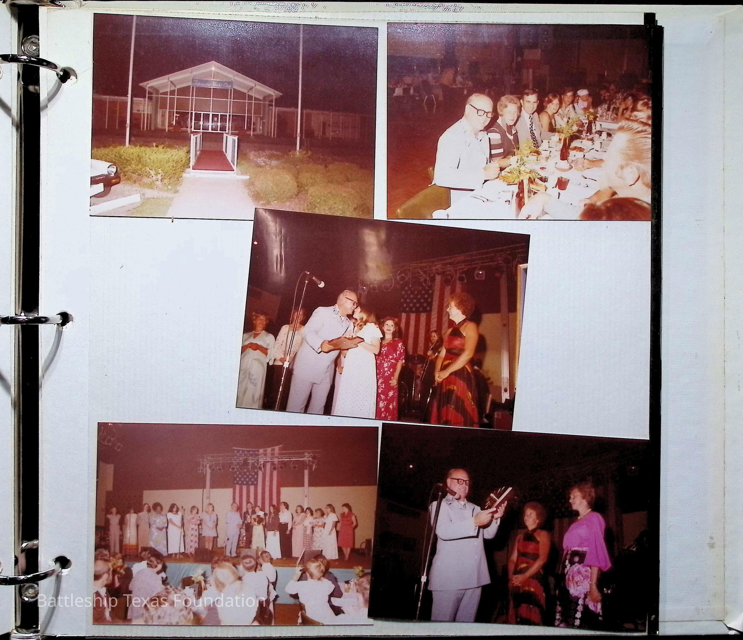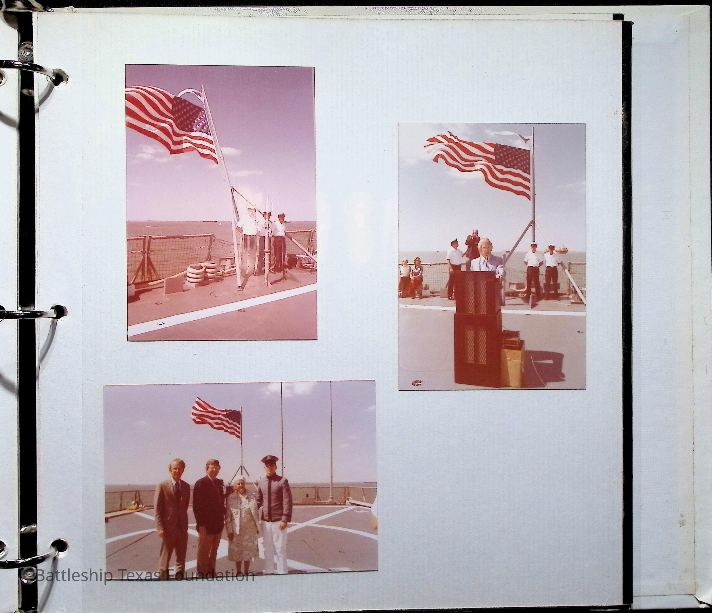 Photo album covering the commissioning of USS Texas (CGN-39). First page titled "A Remembrance of the Commissioning" "From your Texas friends" and presented to Captain Peter B. Fiedler. Only the first thirteen pages are filled, each with varying numbers of photos, totaling forty-three.Context