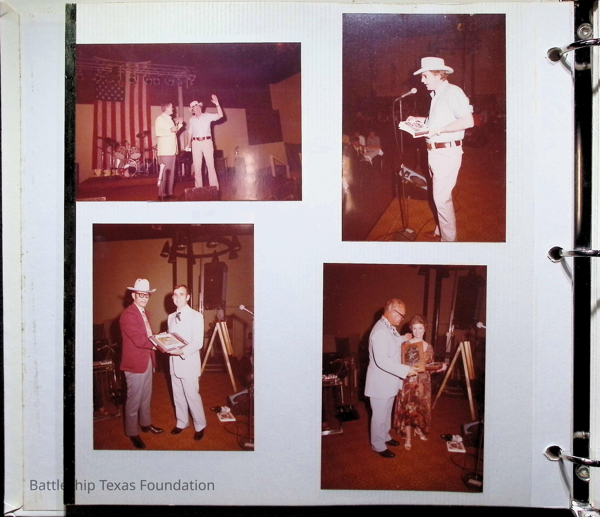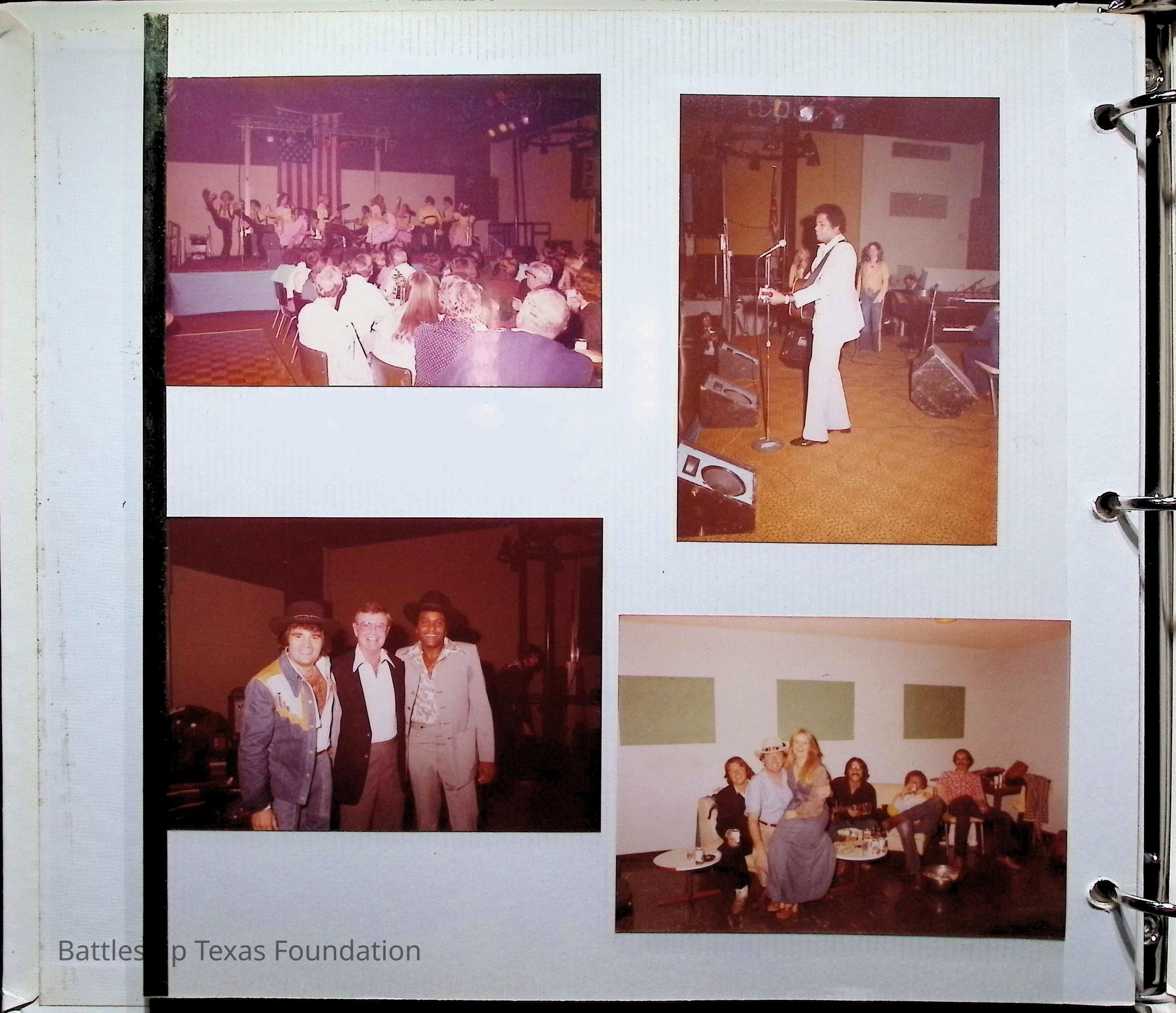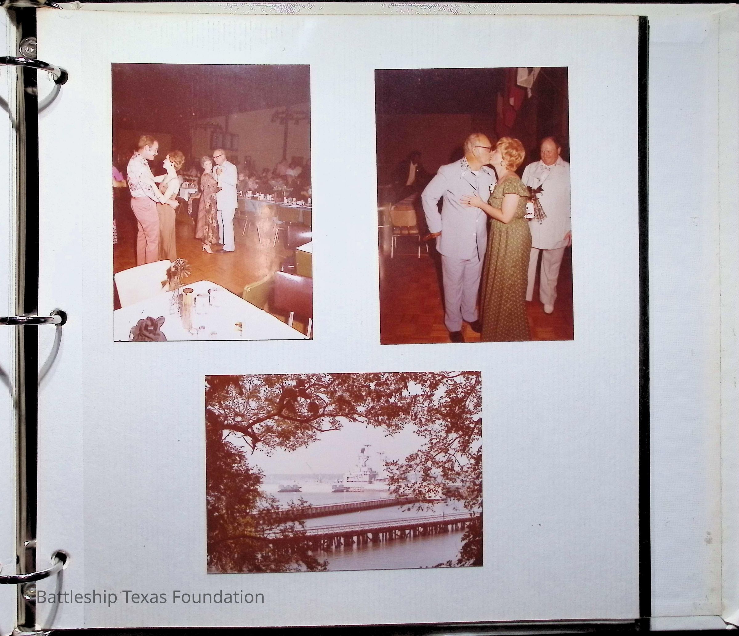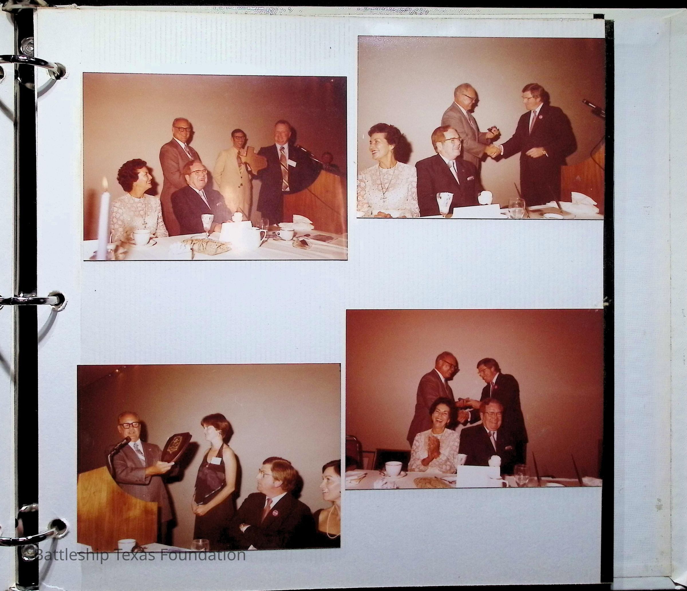 Photo album covering the commissioning of USS Texas (CGN-39). First page titled "A Remembrance of the Commissioning" "From your Texas friends" and presented to Captain Peter B. Fiedler. Only the first thirteen pages are filled, each with varying numbers of photos, totaling forty-three.Context