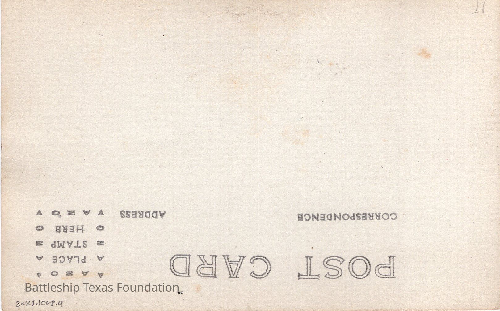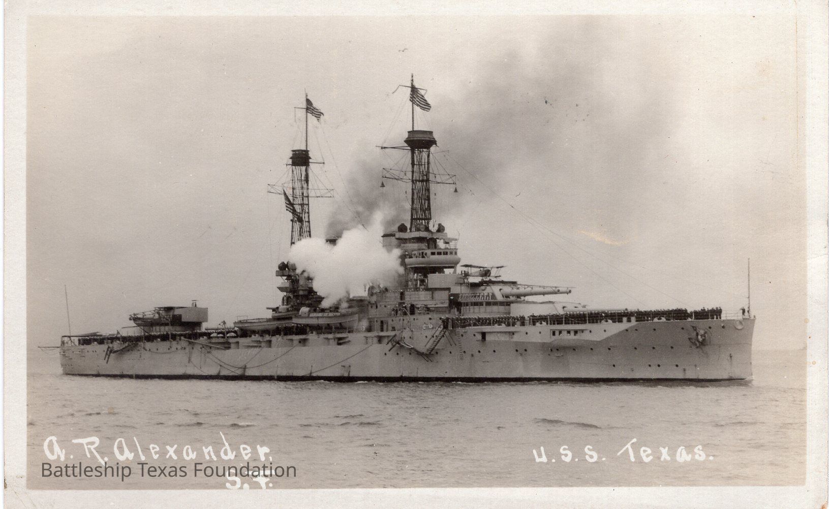 Photograph taken by A. R. Alexander of Texas with cage masts. Both masts have US flags atop. Back is flipped postcard backing.Context