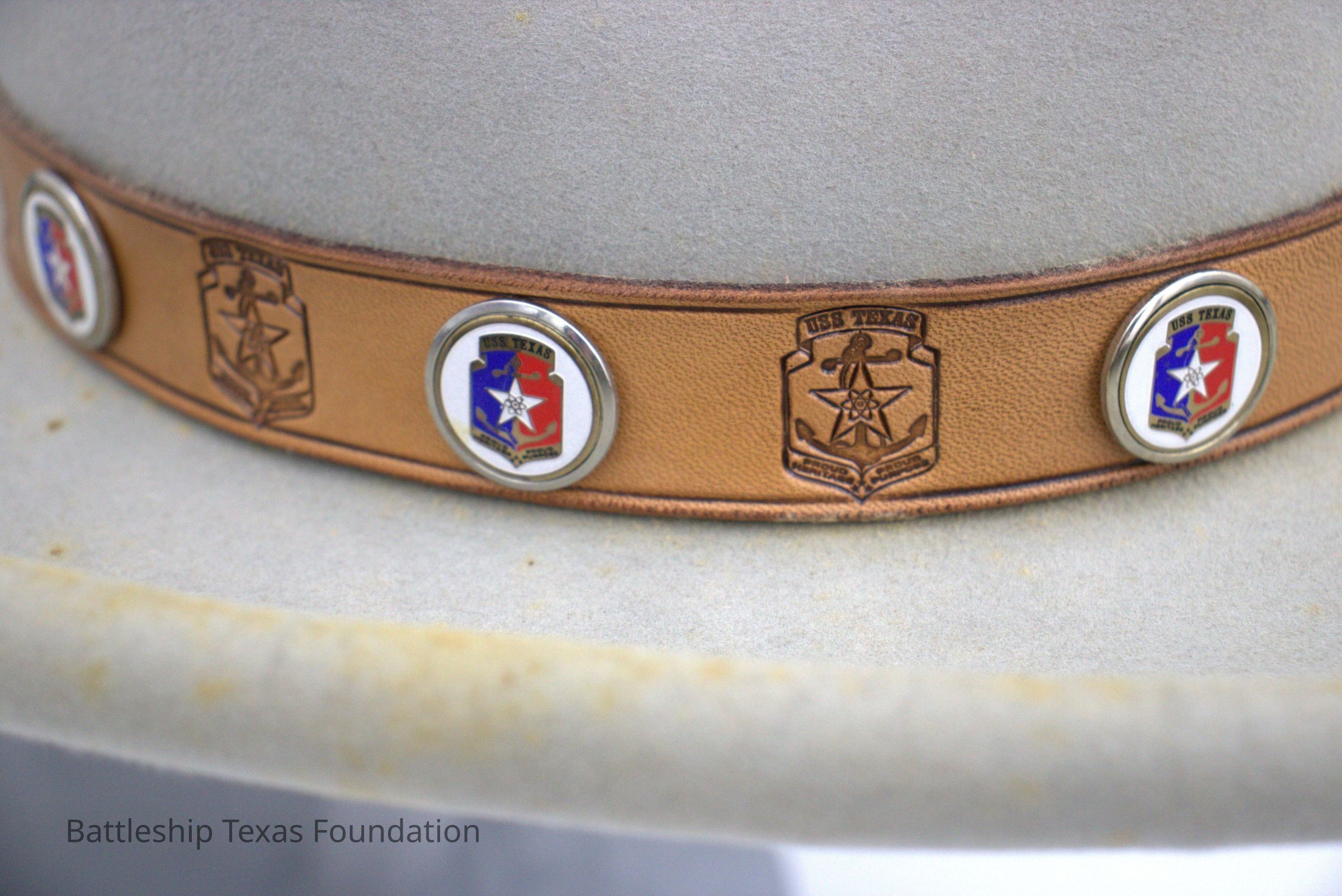 Gray cowboy hat with a brown leather band. Band has alternating Cruiser Texas emblems of it imprinted into the leather, and a circular coin with color. Back says "CAPTAIN" on the band. Hat made by the Texas Hatters.Context