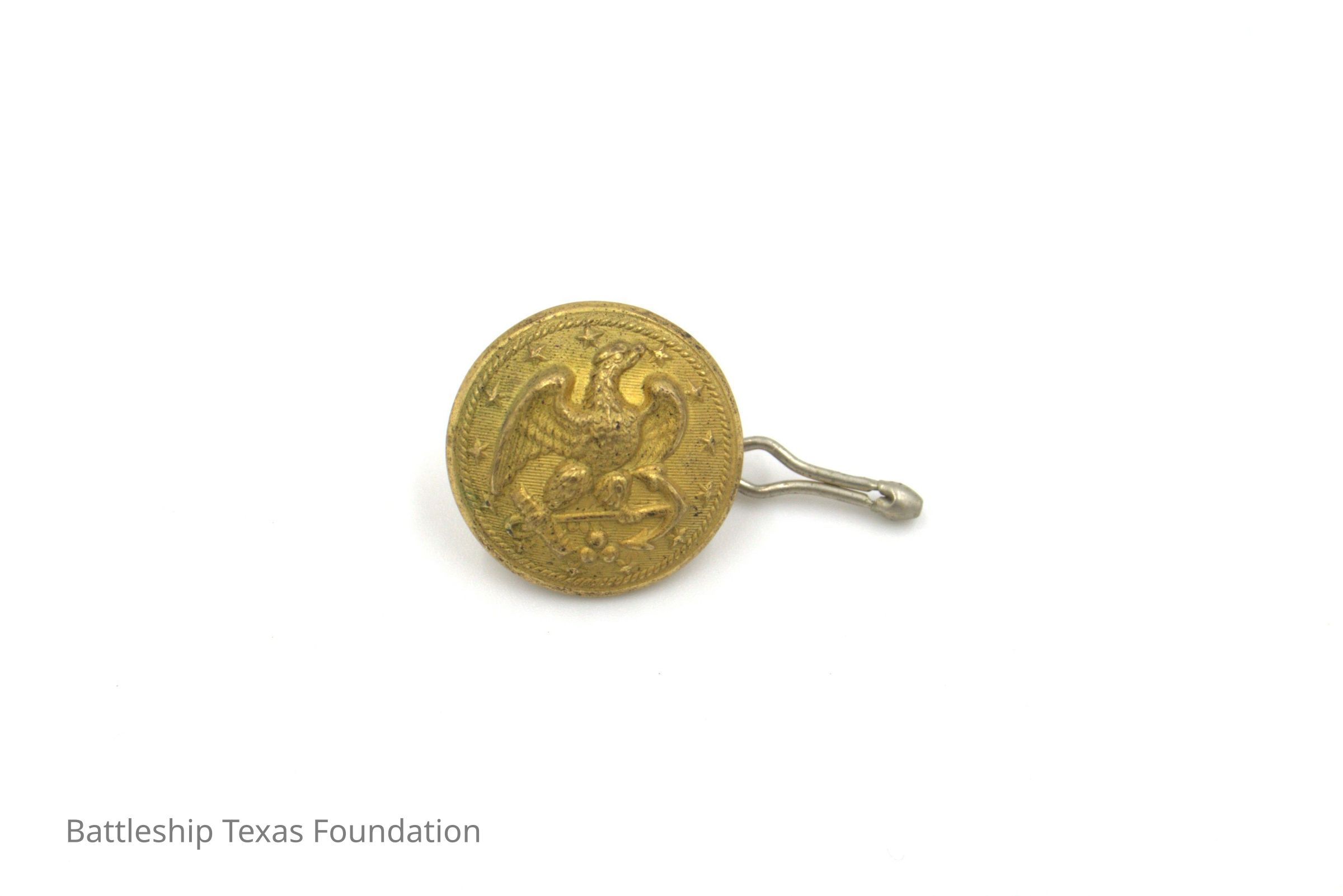 One of fifty-two individual gold buttons owned by Charles R. Pratt as spares for his USN overcoats. Button features an eagle perched on an anchor on the front. Button made by Pamcraft Quality.
