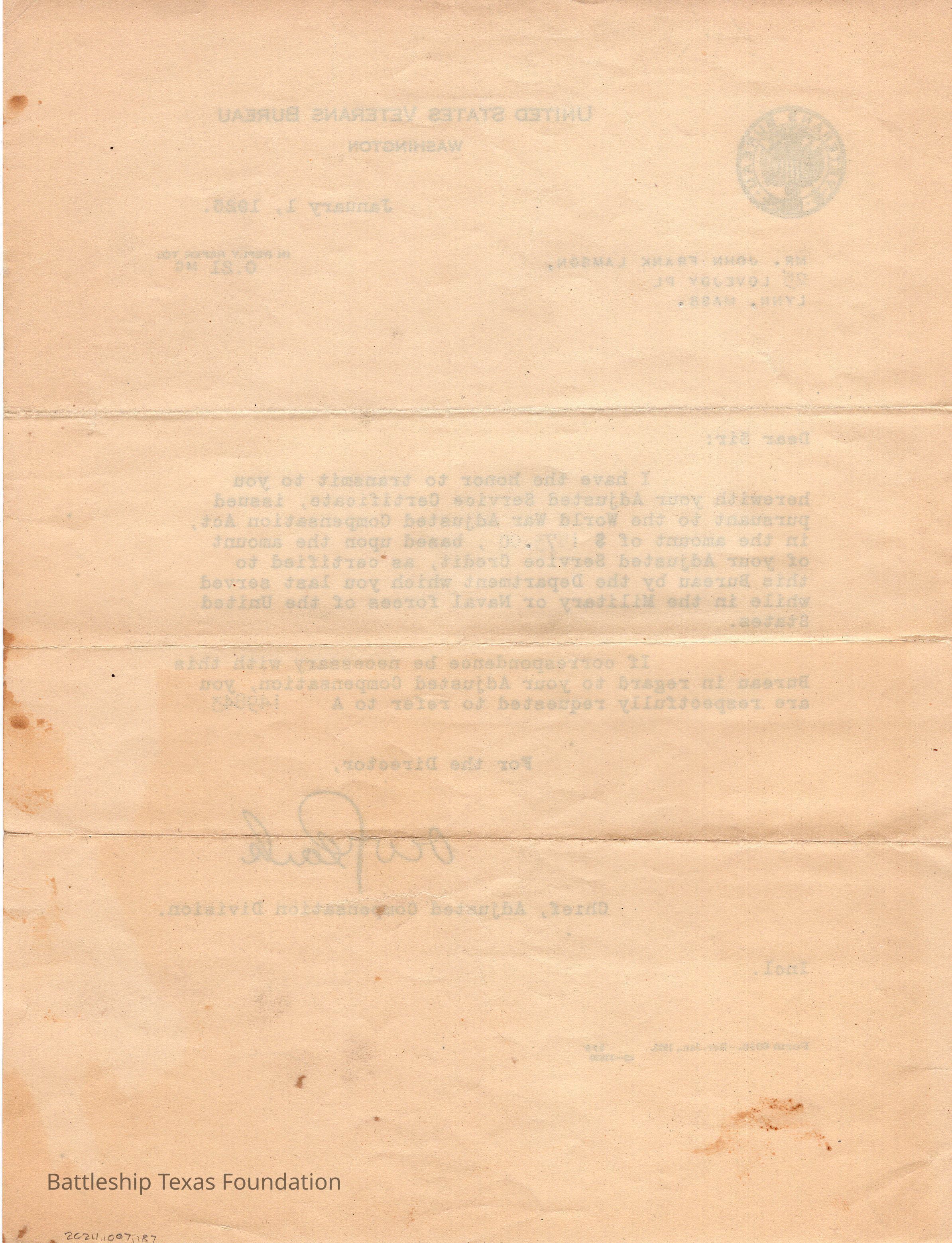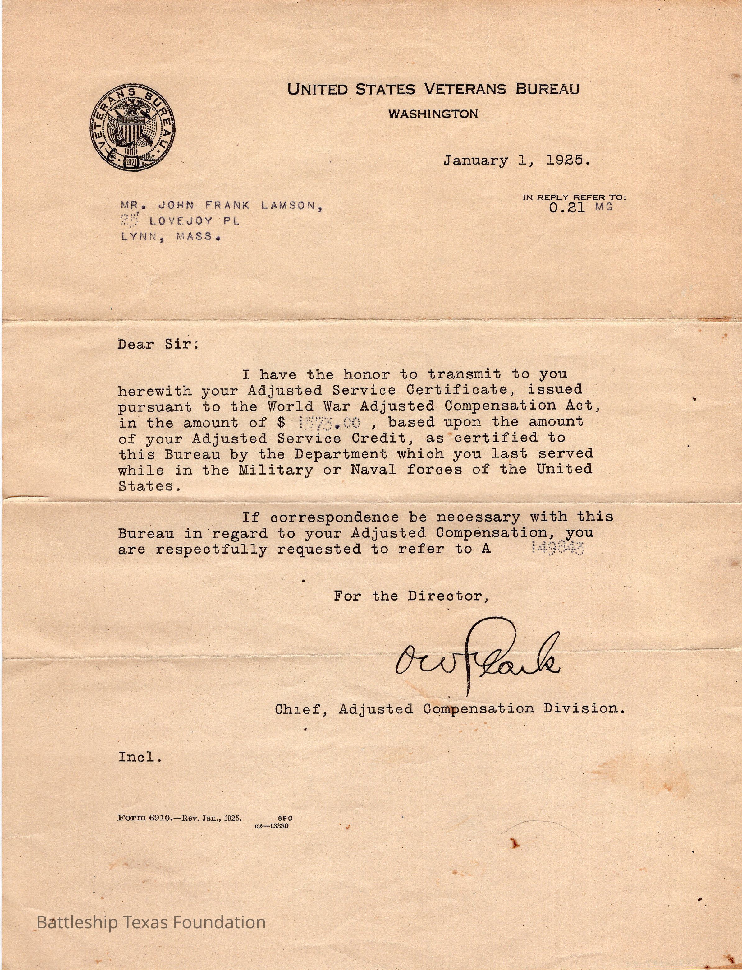 Letter to John Lamson informing him of adjusted compensation for his service in WWI. Dated January 1, 1925Context