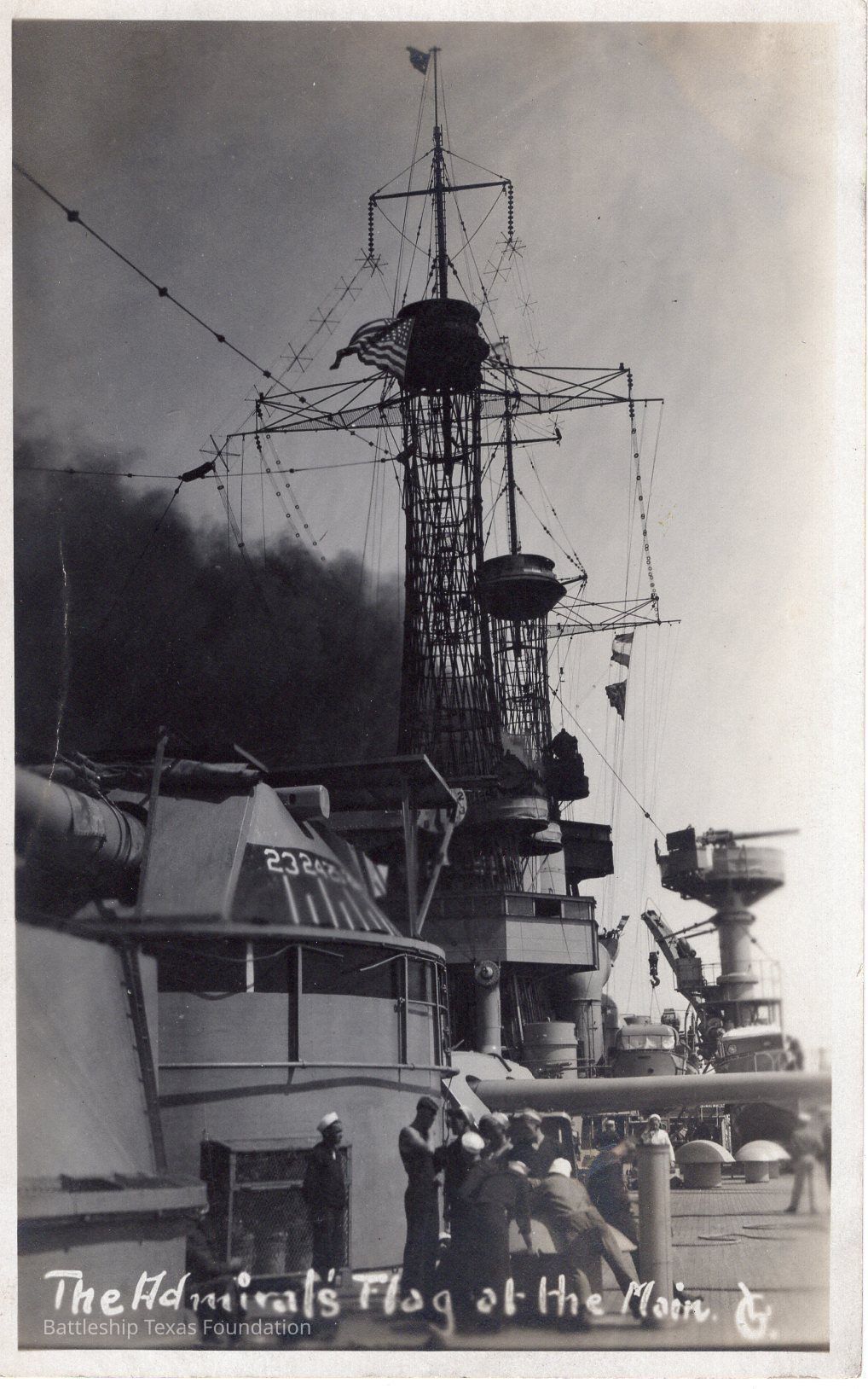 Cage masts. Smoke billowing to port. Turret #3 turned to starboard. Sky guns on crane. Captioned "The Admiral's flat at the Main."Context